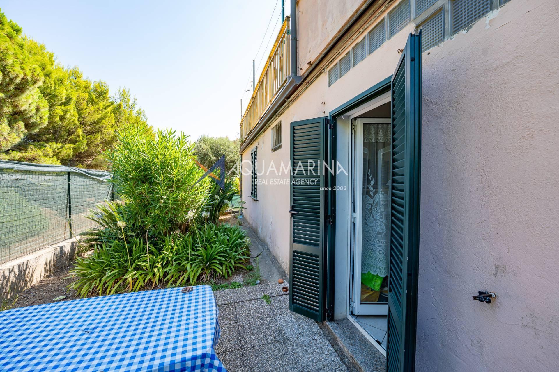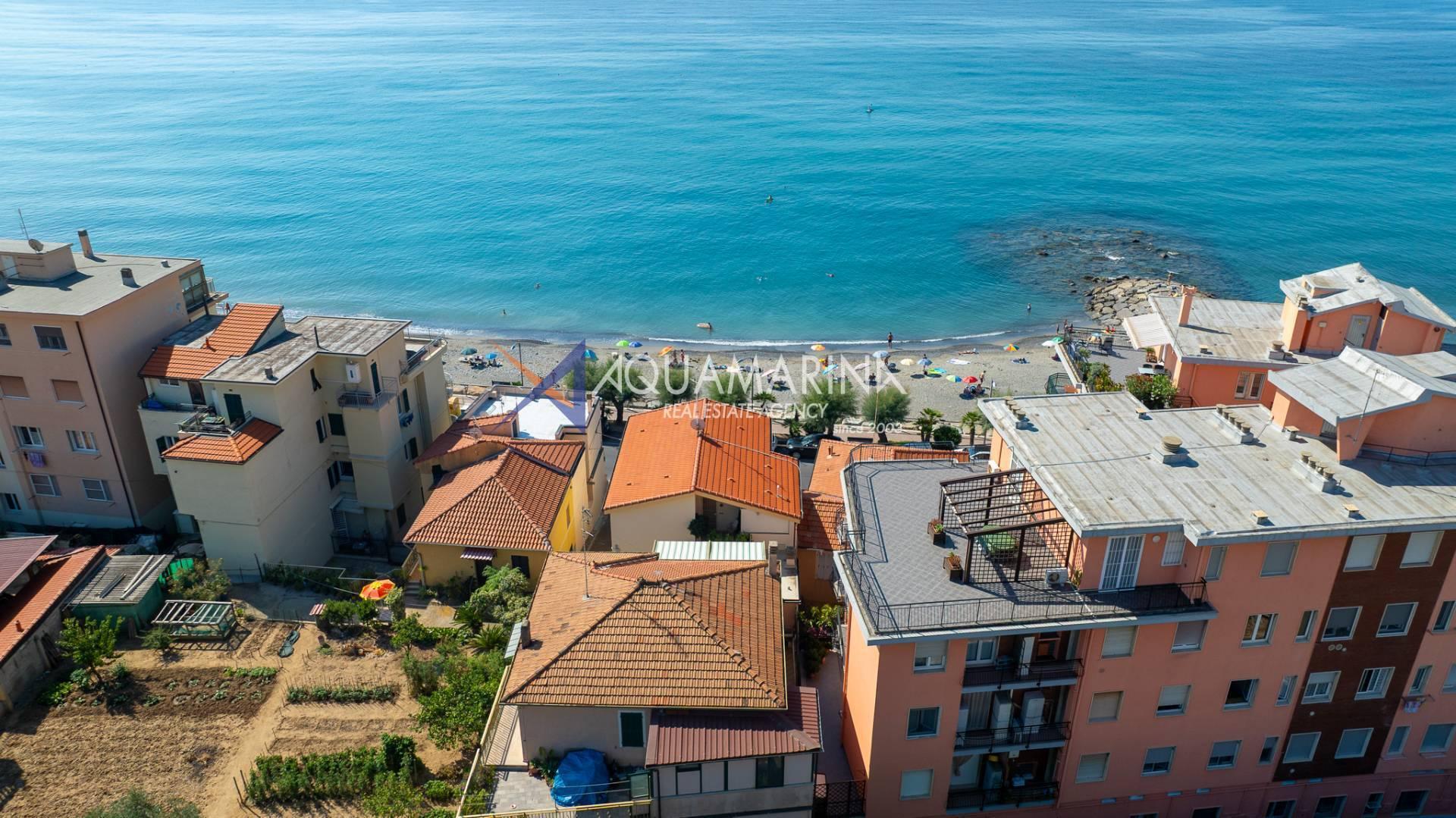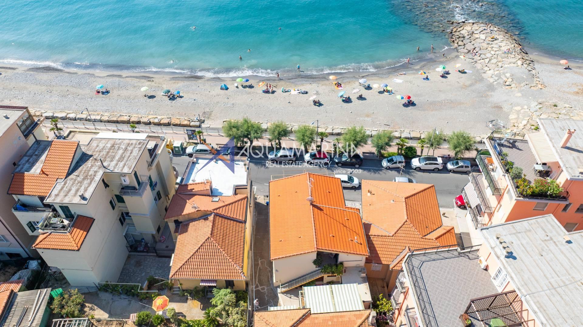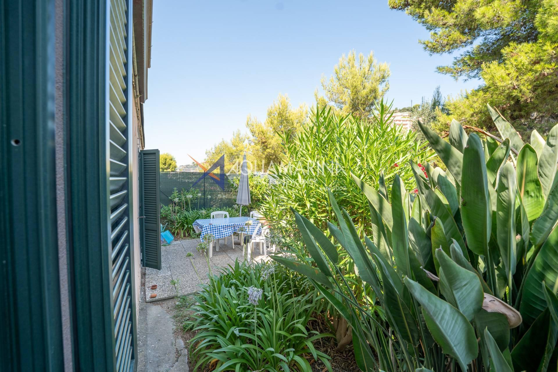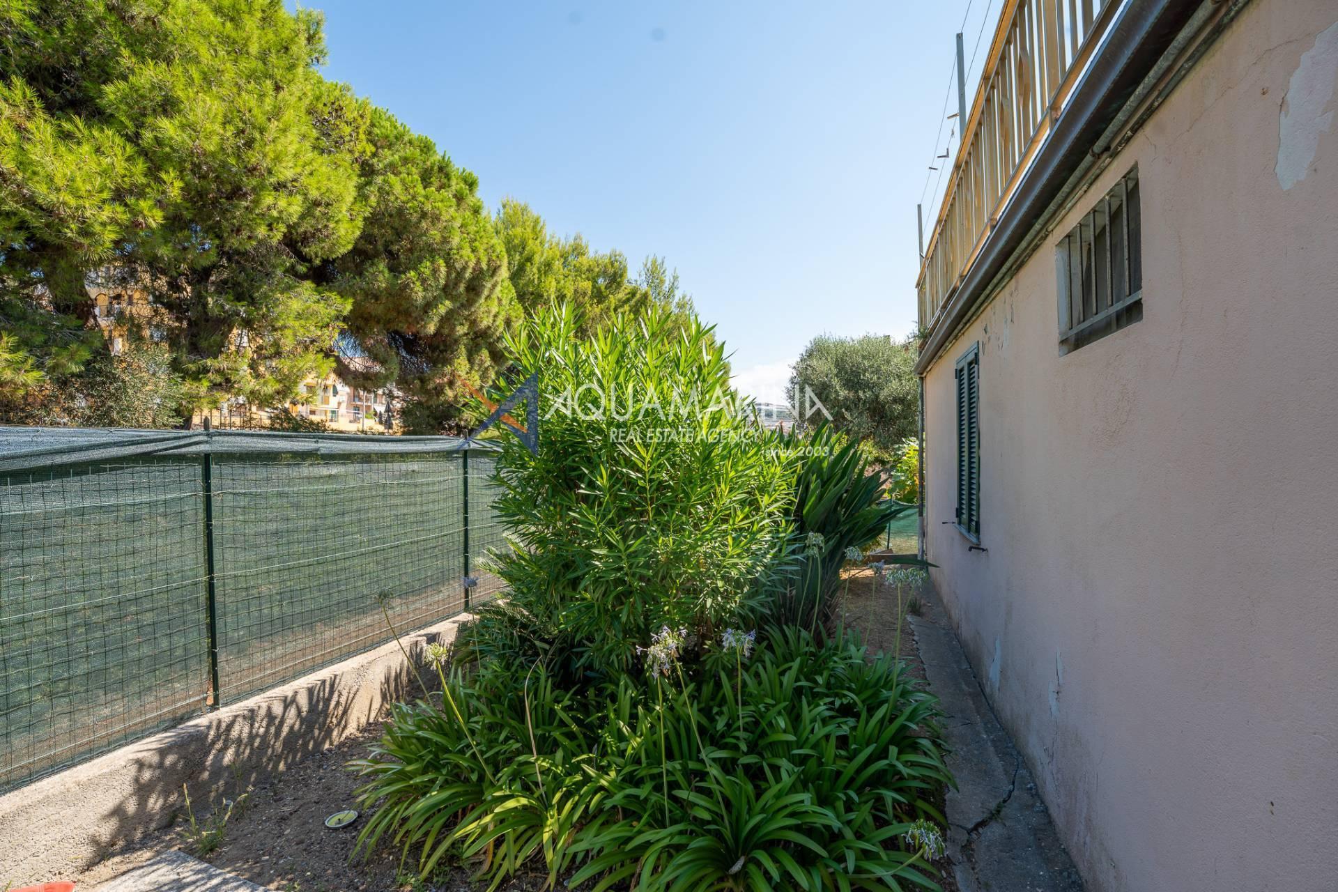 The property is also divided into two apartments, both with independent access on the ground floor: the first apartment is a three-room apartment with a porch and sea view; the second apartment is a two-room apartment with a garden and views of the Cycling Riviera cycle path.