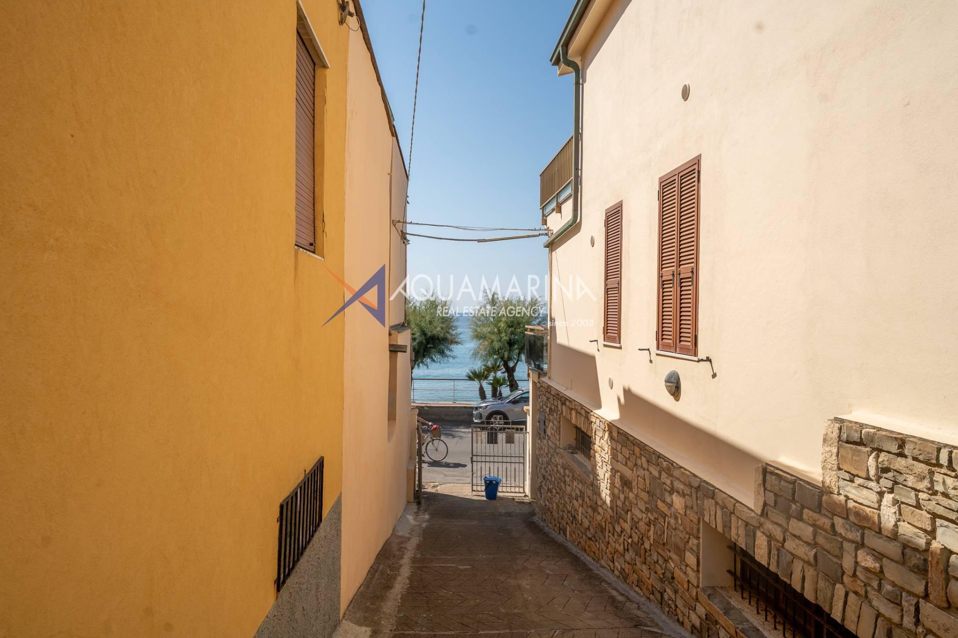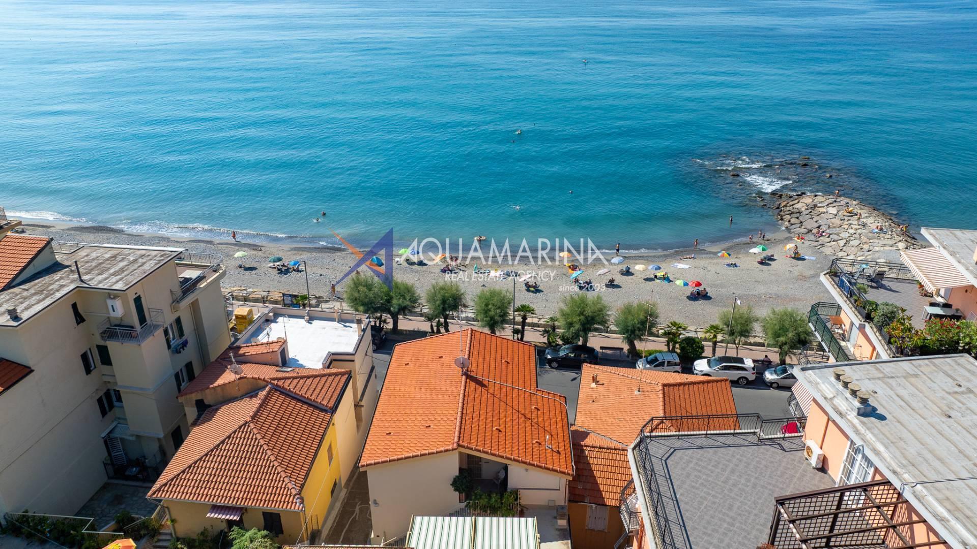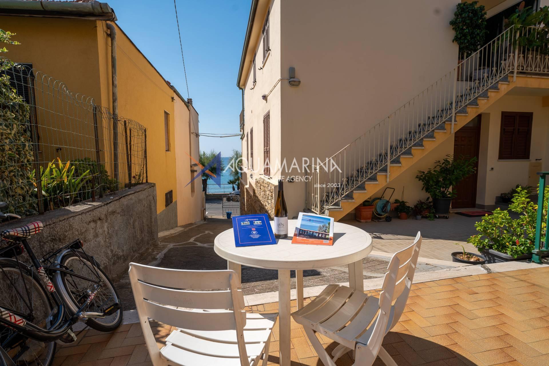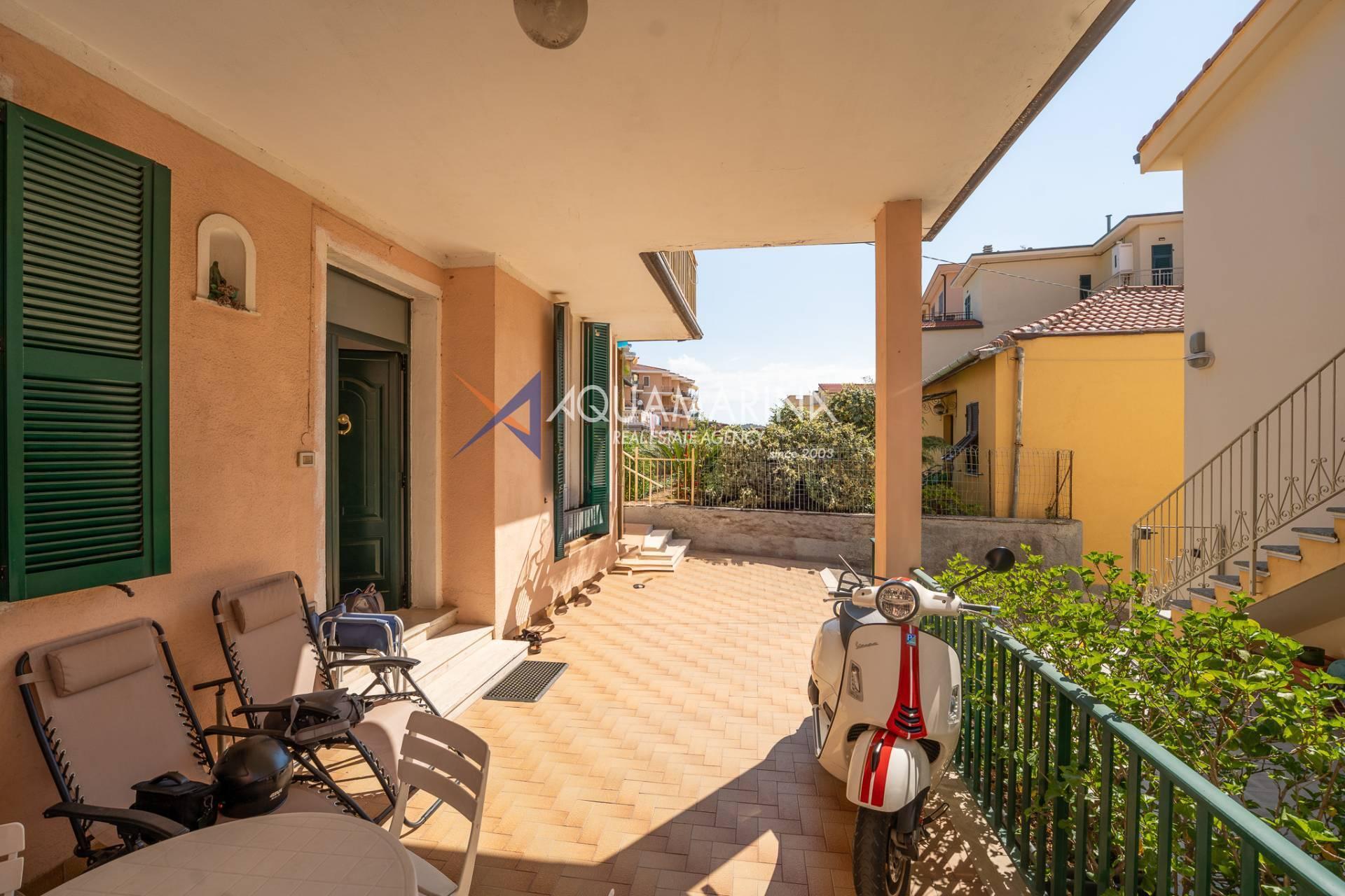 The property is also divided into two apartments, both with independent access on the ground floor: the first apartment is a three-room apartment with a porch and sea view; the second apartment is a two-room apartment with a garden and views of the Cycling Riviera cycle path.