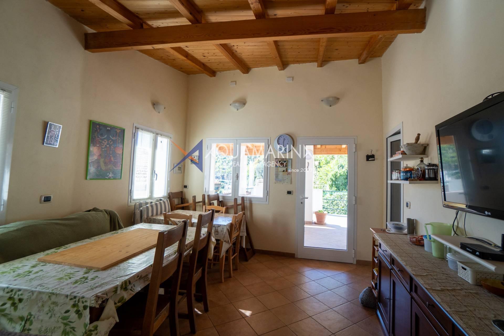 Entering from the third floor, which serves as the living area, you are welcomed by a lovely garden with a vegetable patch-ideal for those who enjoy green spaces and outdoor living. A large terrace covered by a canopy offers the perfect setting for meals or relaxing moments, enjoying the tranquillity and the surrounding landscape. From here, you enter the interior, where you find a bright living room with lounge area, an open semi-habitable kitchen, and a convenient guest bathroom.