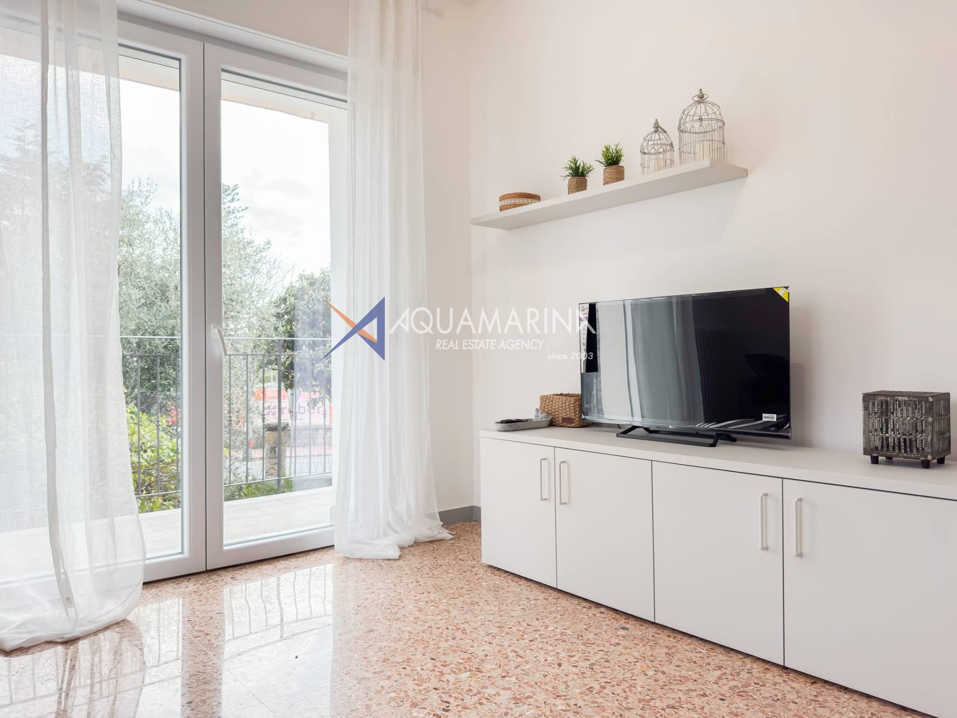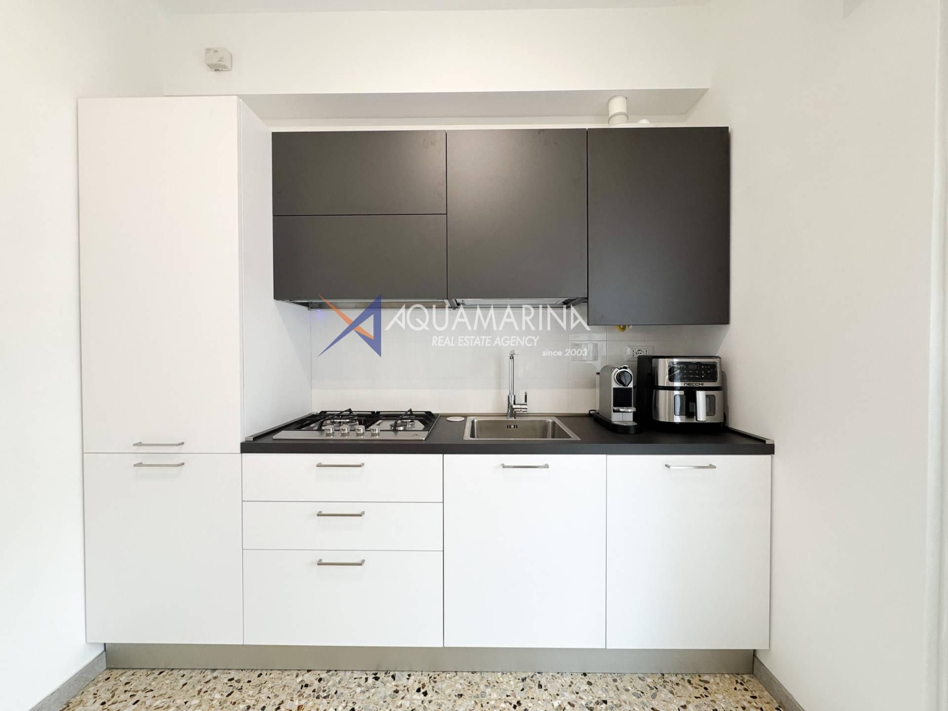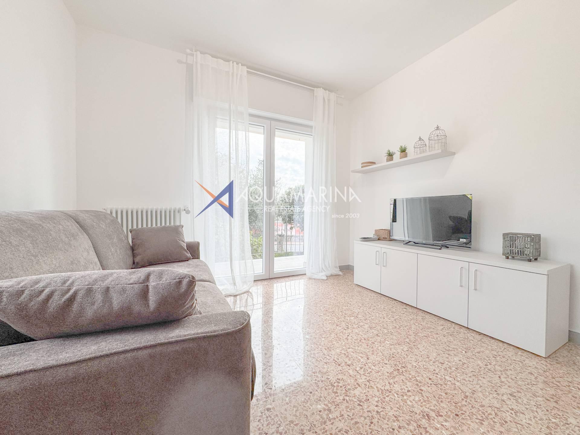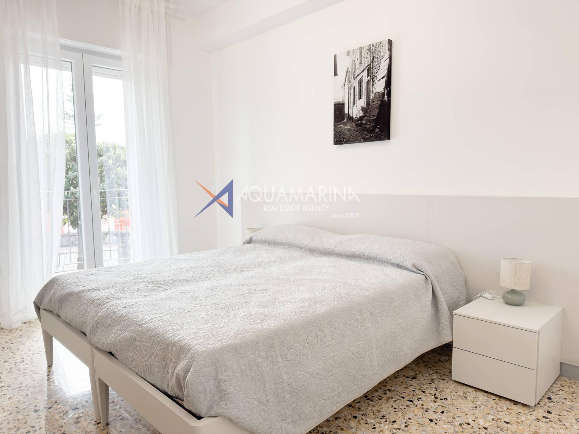 Just steps from the sea, in a flat, green area close to all amenities and conveniences, we offer for rent a 55 sq m apartment located on the first floor of a small building without a lift. The apartment comprises an entrance hall, living room with a sofa bed, kitchen with balcony, double bedroom with walk-in closet, bathroom with shower, and terrace.