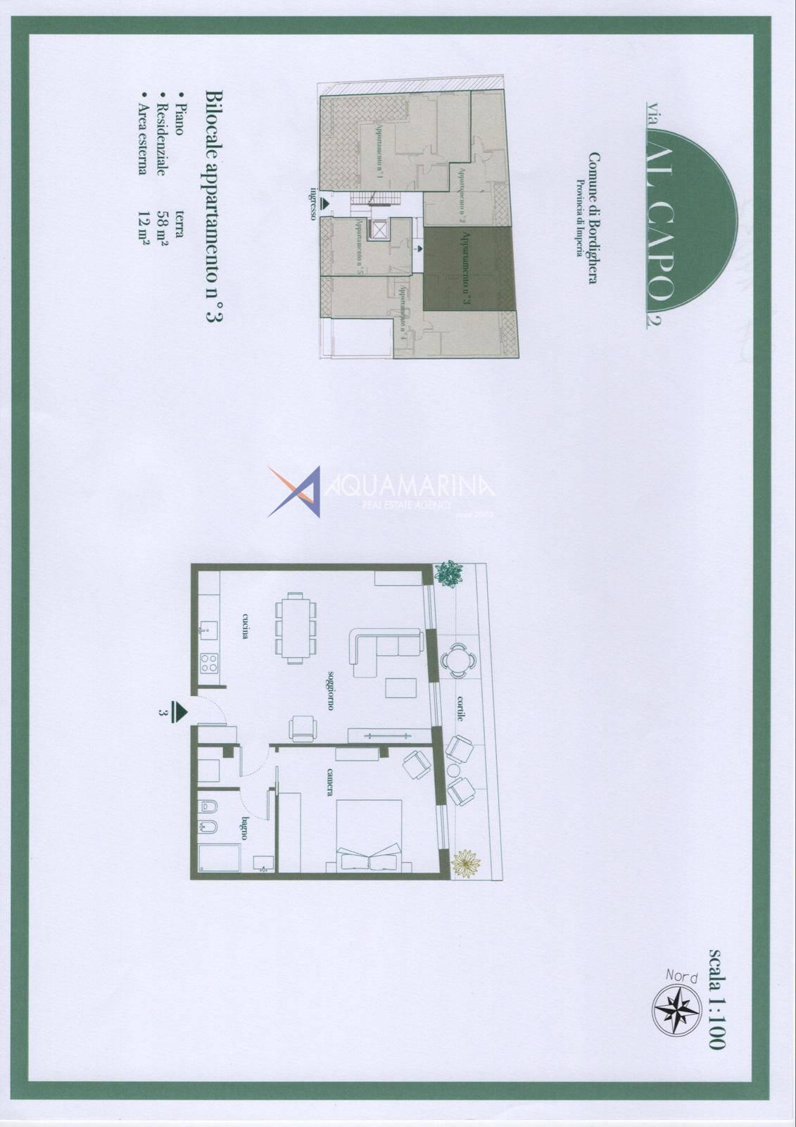 At the entrance to the beautiful historic village, in the exclusive newly built building called "Via al Capo", in Bordighera Alta, we are selling a 58 sq m two-room apartment on the ground floor, with a 12 sq m outdoor area.