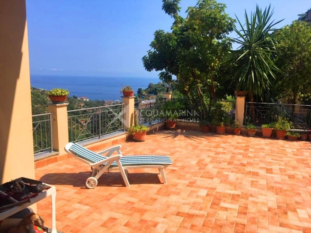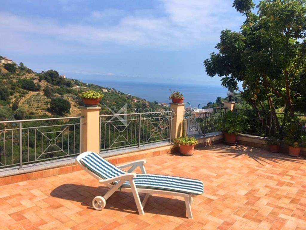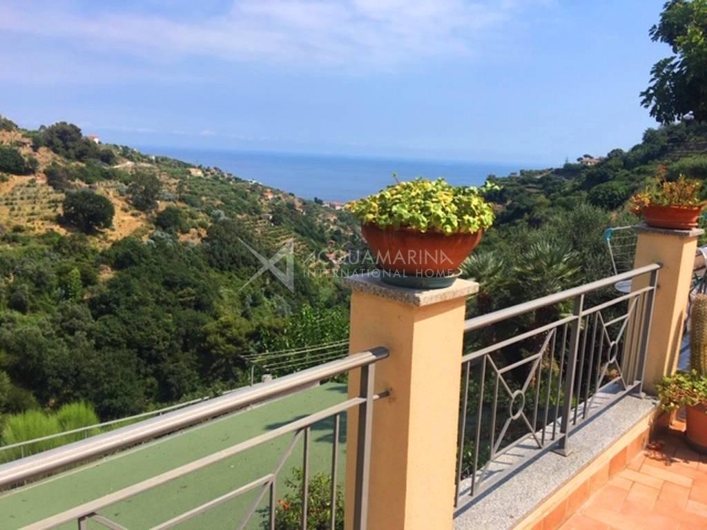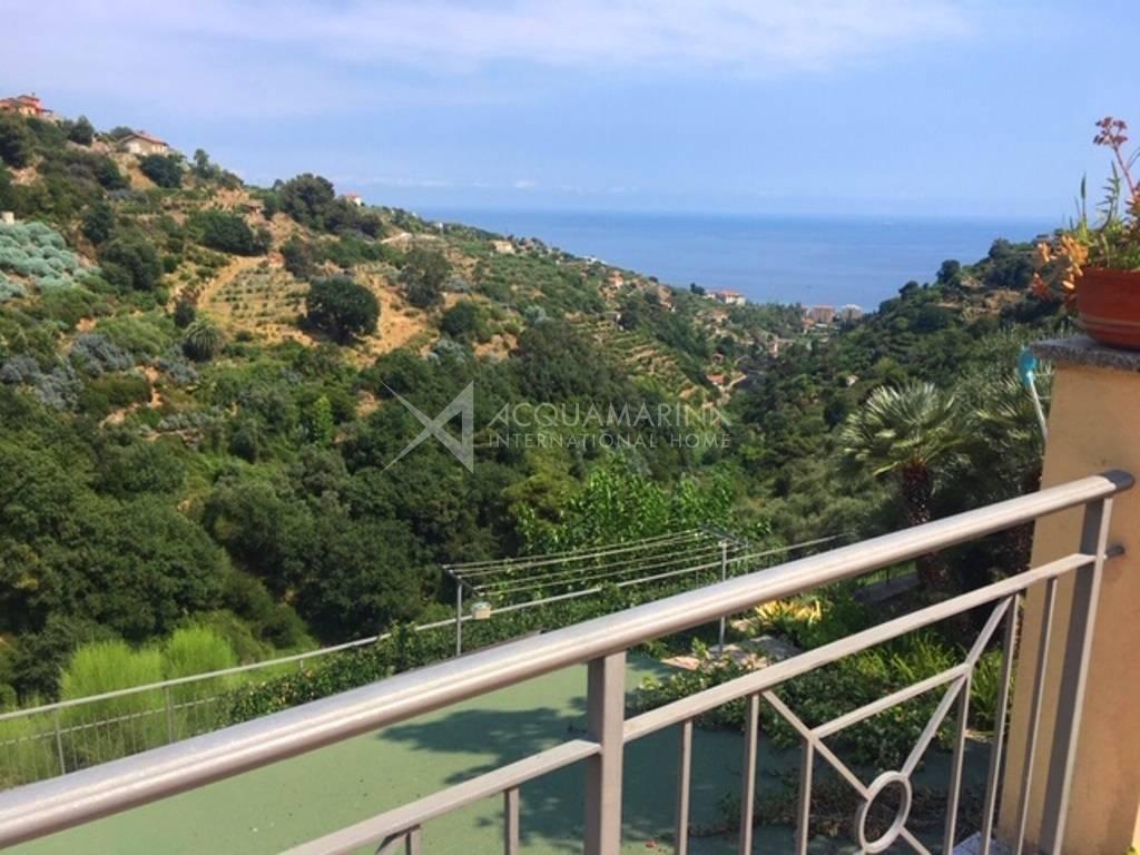 Bordighera, splendid sea view villa on two levels for sale. On the ground floor, it comprises an independent entrance leading to a living room with fireplace and kitchenette, bedroom, bathroom, laundry room, pantry, and cellar.