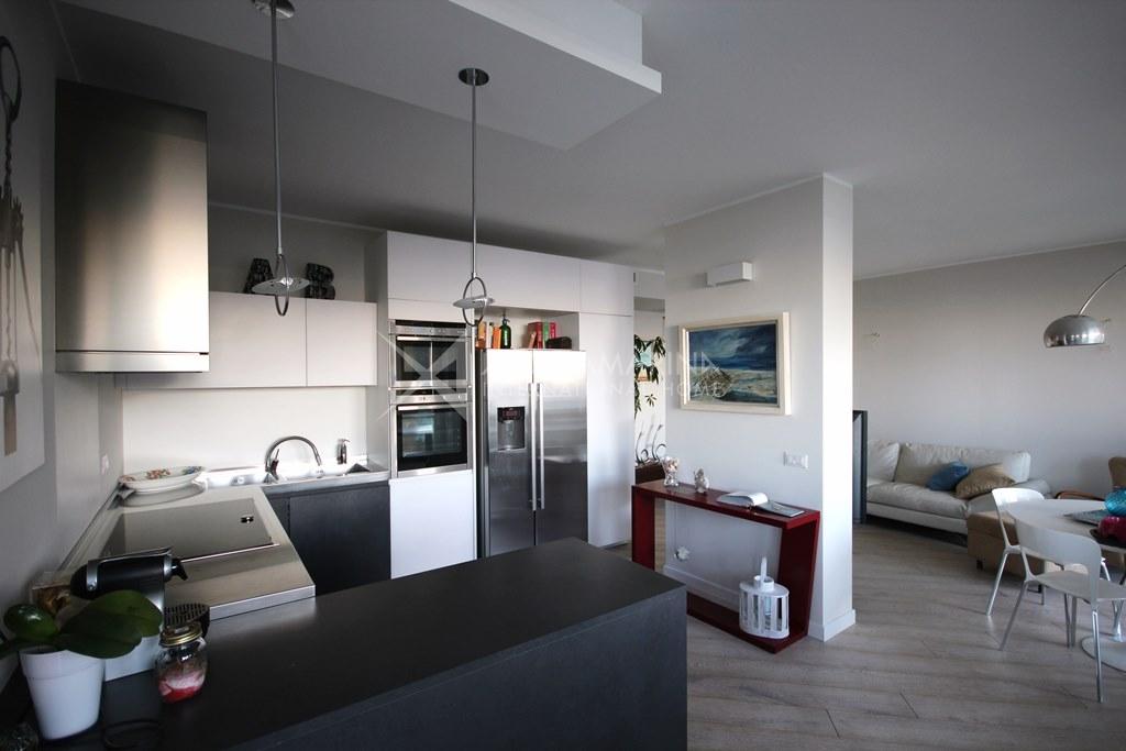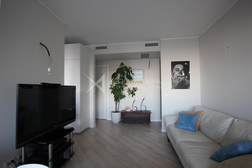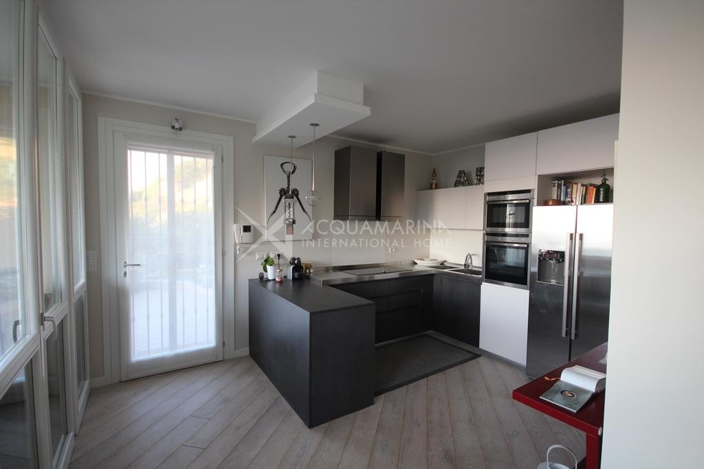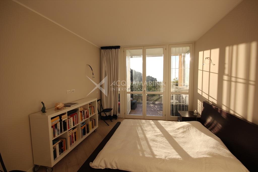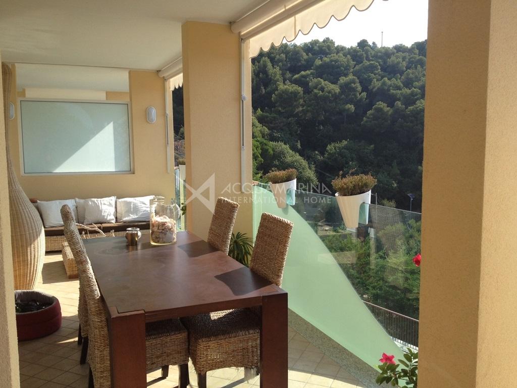 Bordighera/Vallecrosia. Large, bright apartment arranged over two floors, fully furnished and new. Surrounded by lush vegetation, in a very quiet area, amazing sea view, in a residence with a swimming pool. Private garden, large terraces. The apartment consists of: entrance, large sea view open space with kitchen and living room (that can be separated), three bedrooms, two large walk-in closets. Two luxuriously appointed bathrooms and one laundry. Double garage and cellar.It promises the advantages of an apartment without giving up outdoor beautiful leaving spaces.
