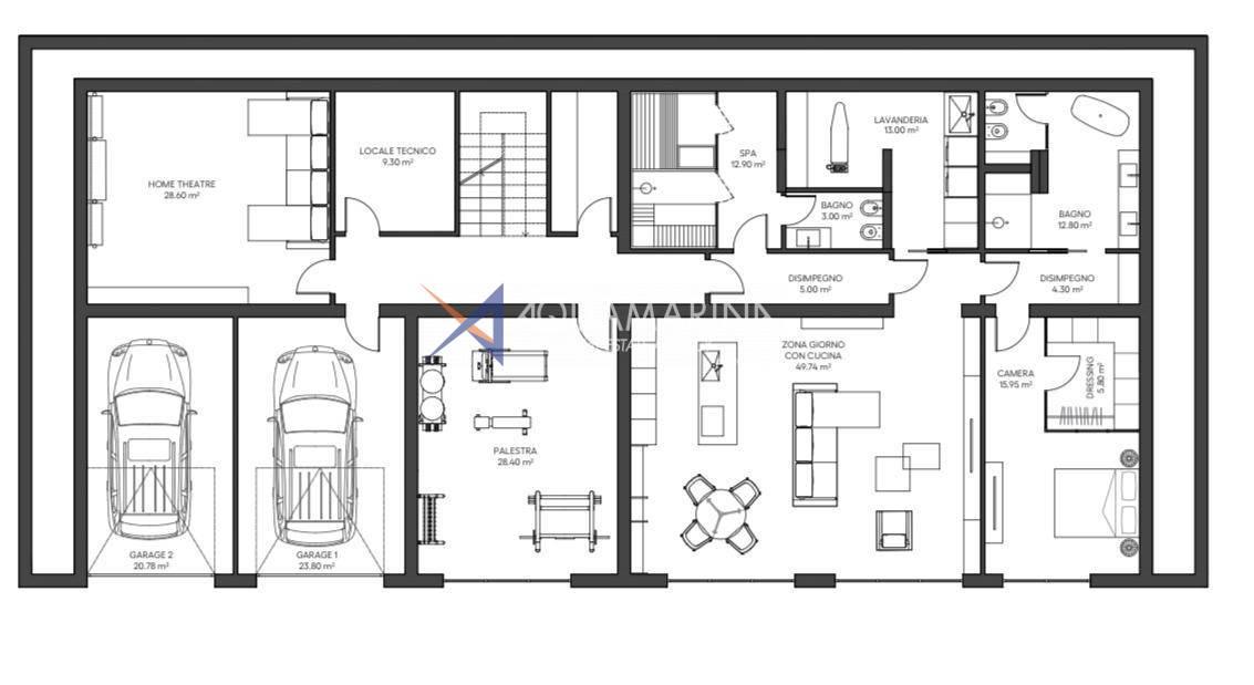 Spacious living room with kitchen, bedroom, bathroom, laundry room with guest toilet, SPA area, fitness room / game room, technical room, storage room, 2 garages.