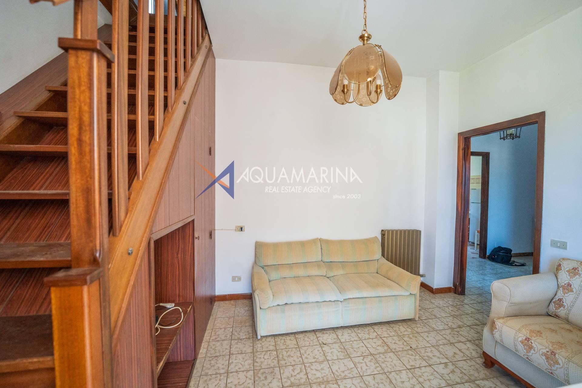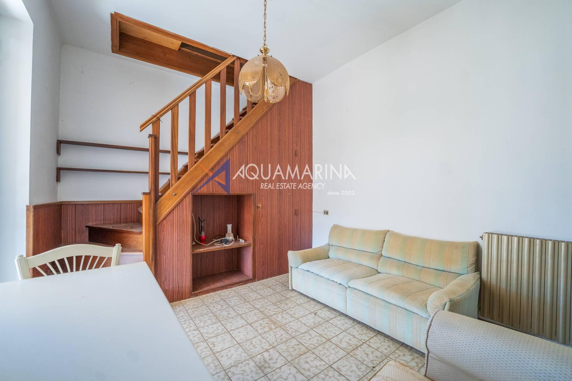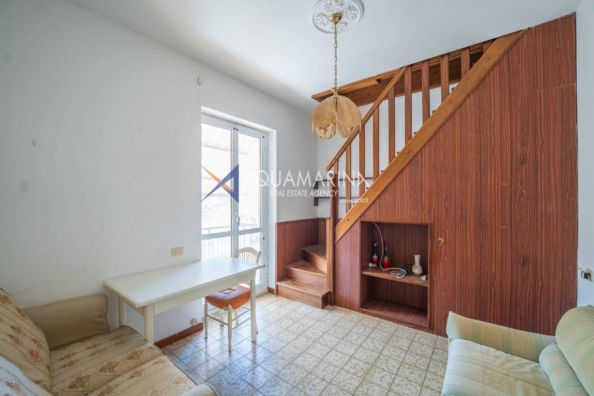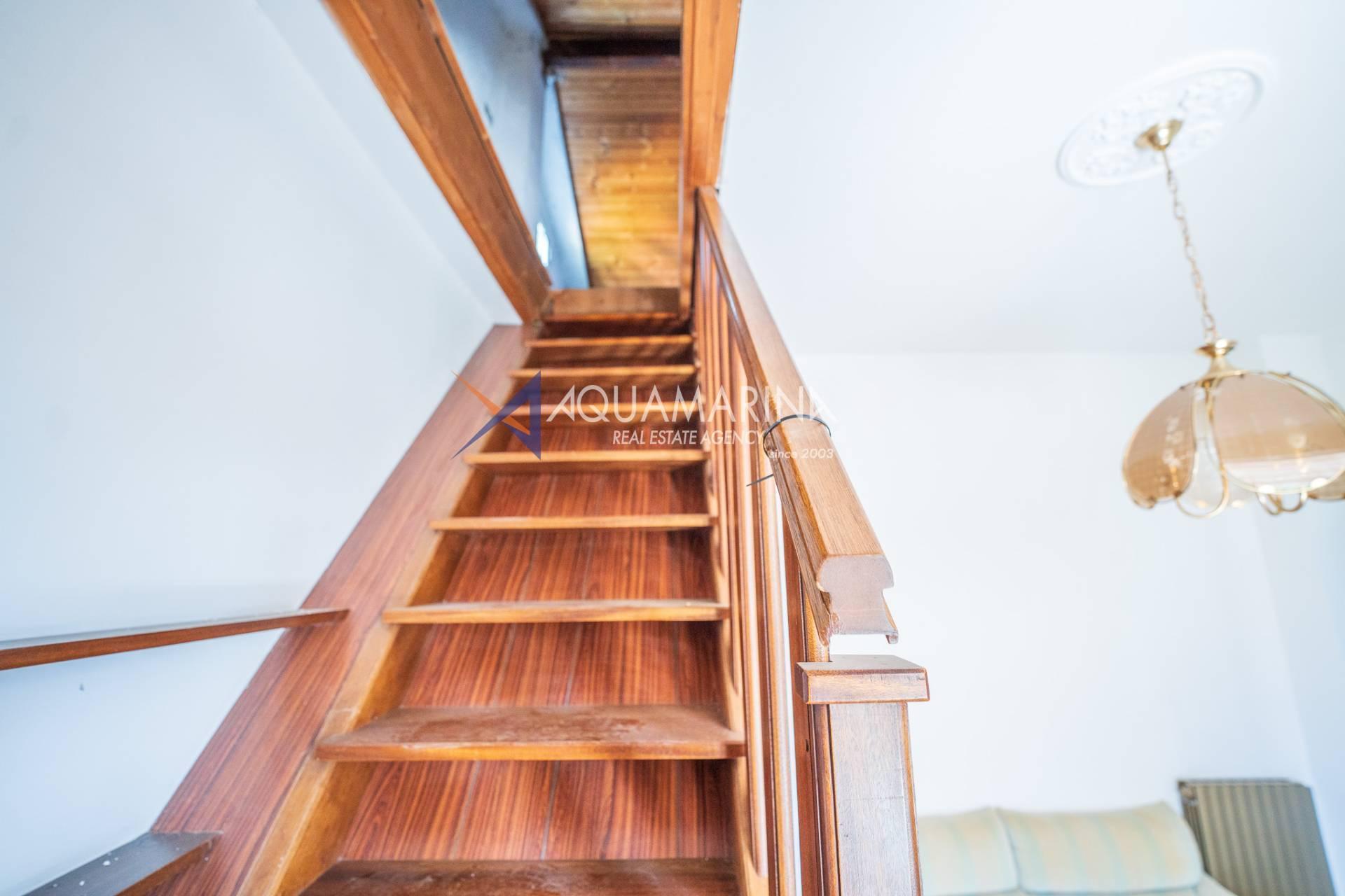 The property is arranged over two levels and is composed as follows: entrance hall, fully equipped kitchen, large living room, two double bedrooms, balcony, two bathrooms, and an upper-level attic, perfect for guests or as a versatile living space.