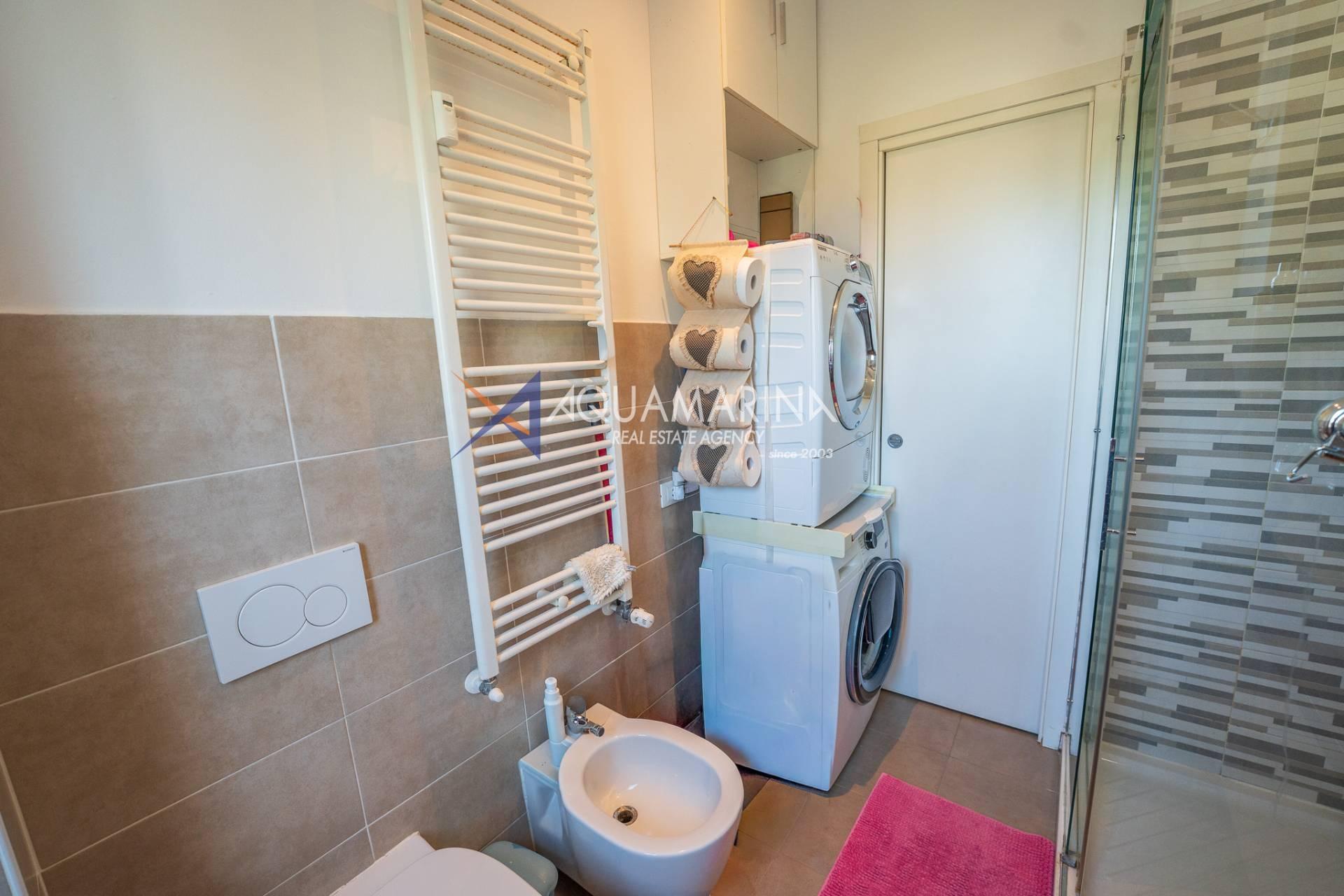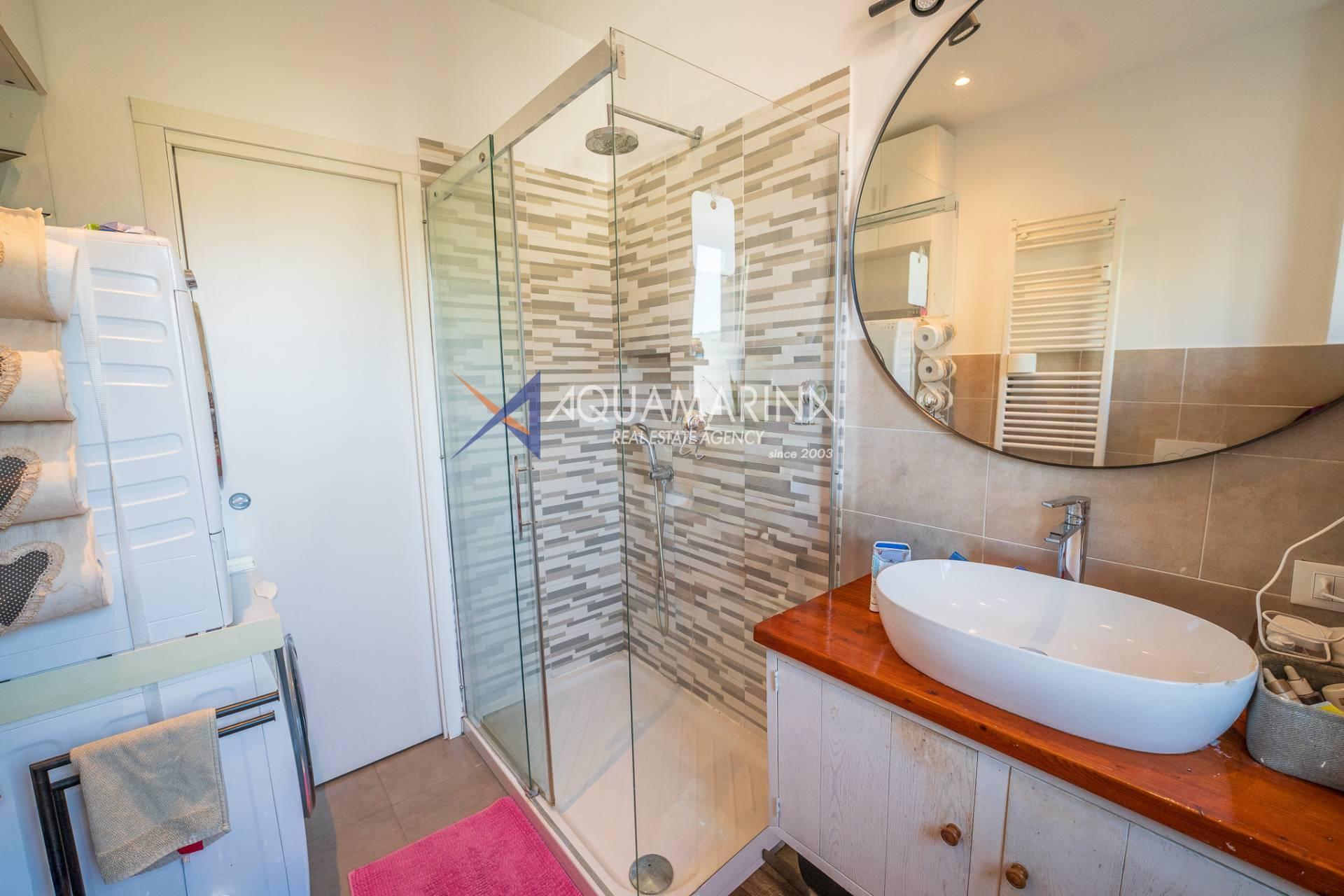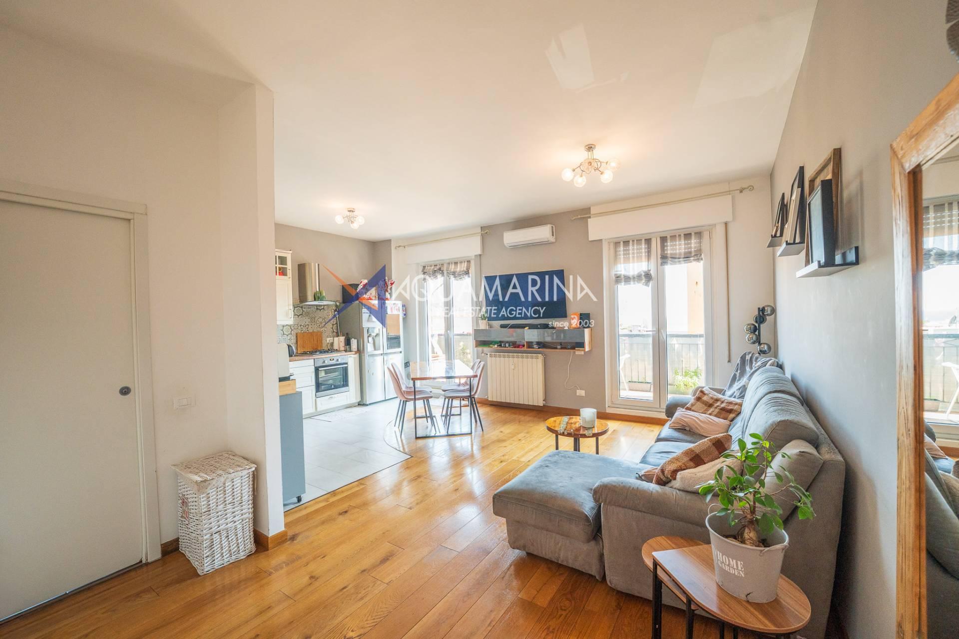 The apartment opens onto an entrance hall that leads to the living area, consisting of a bright living room with an open-plan kitchen, a welcoming and well-organized space. From here, you can access a large balcony with a pleasant sea view, ideal for relaxing.