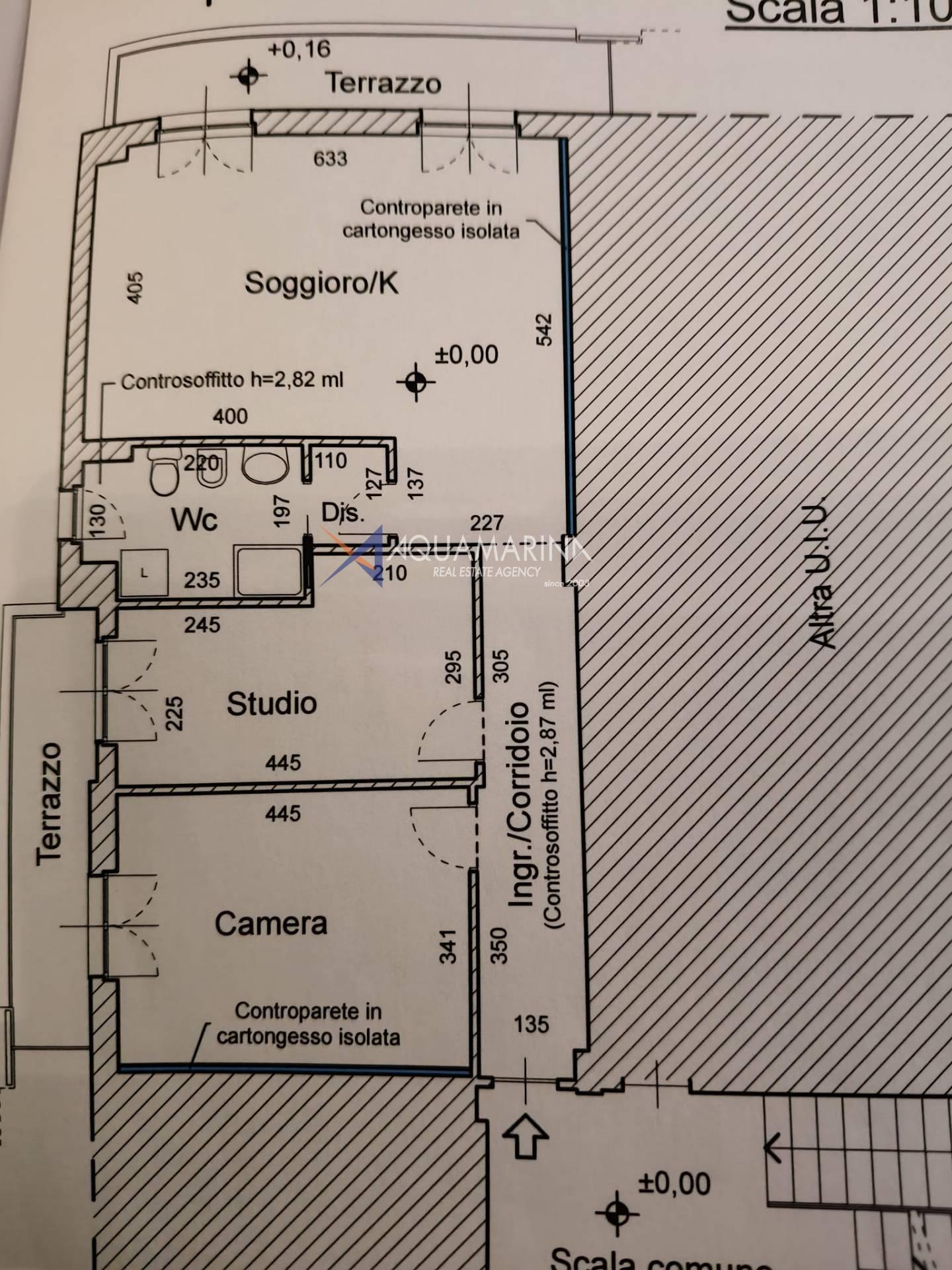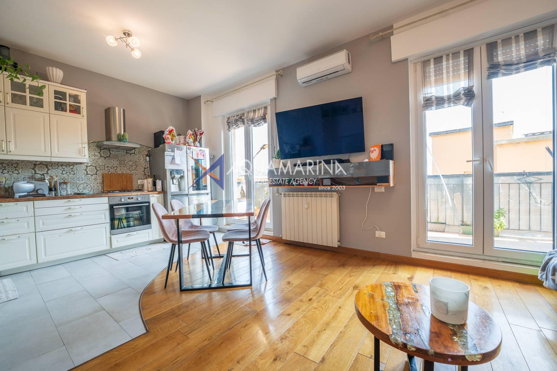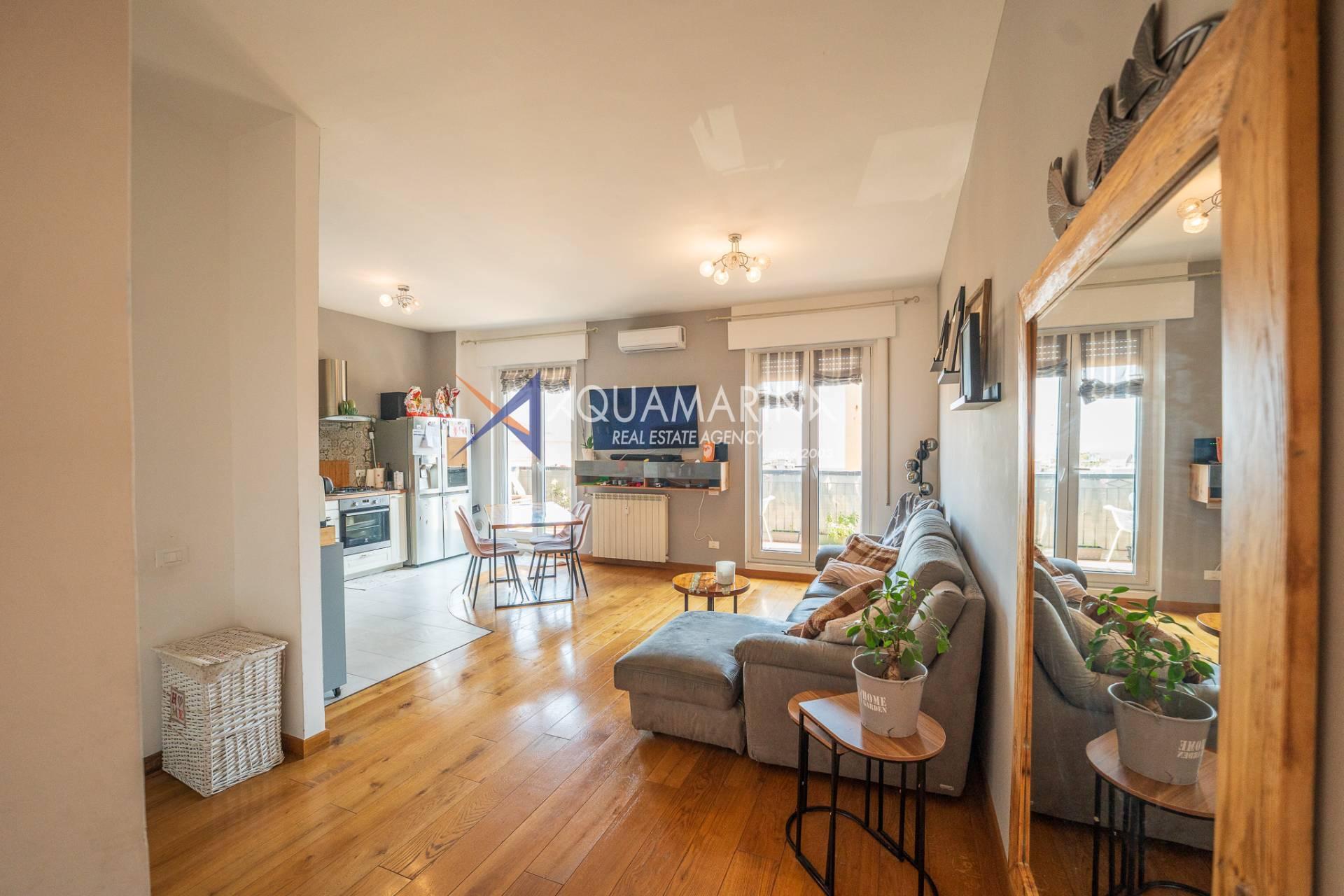 The apartment opens onto an entrance hall that leads to the living area, consisting of a bright living room with an open-plan kitchen, a welcoming and well-organized space. From here, you can access a large balcony with a pleasant sea view, ideal for relaxing.
