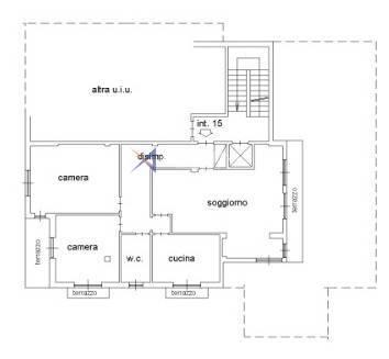 The apartment features a large entrance hall leading to the living area, a semi-habitable kitchen, two double bedrooms, and a bathroom.