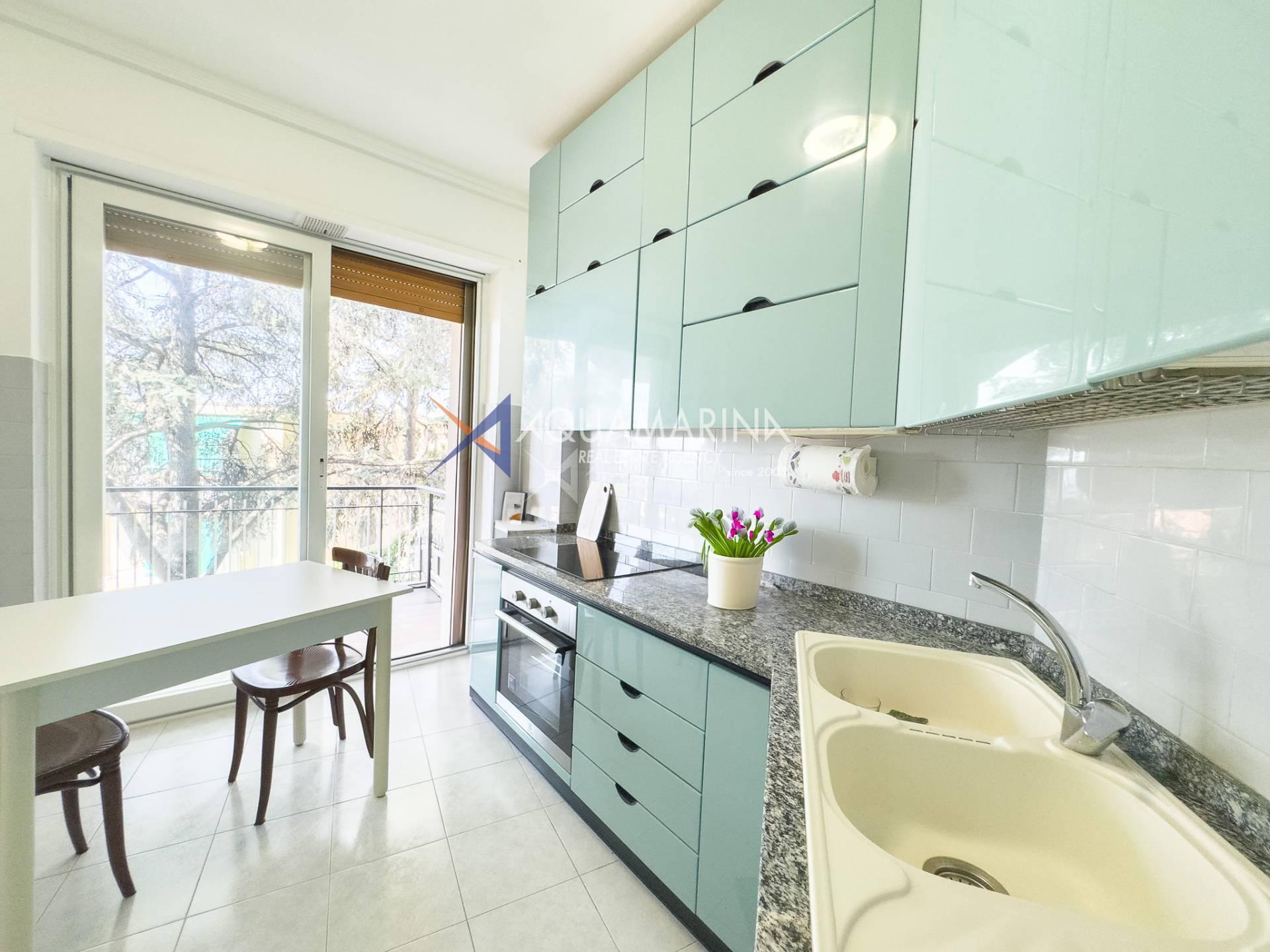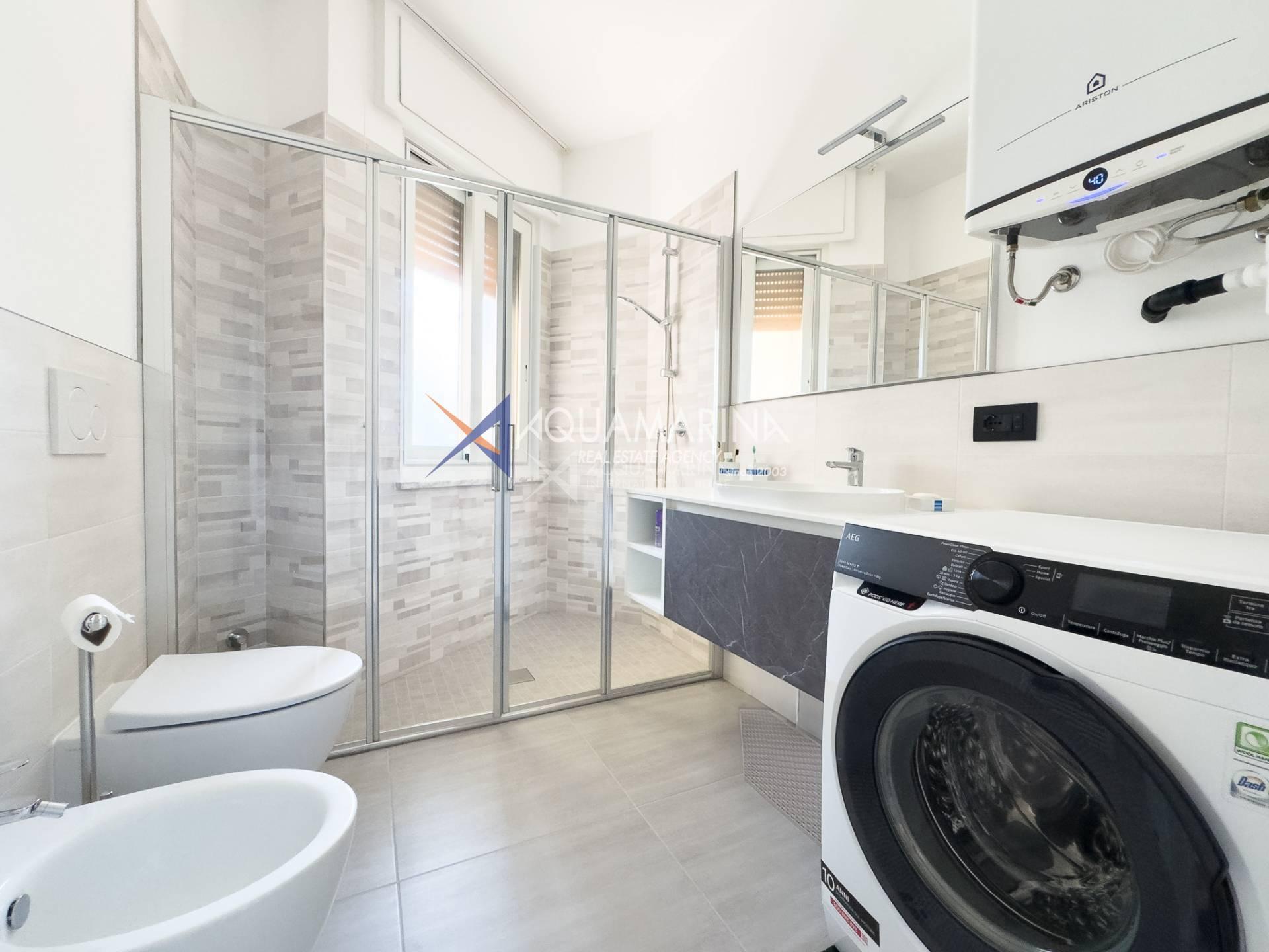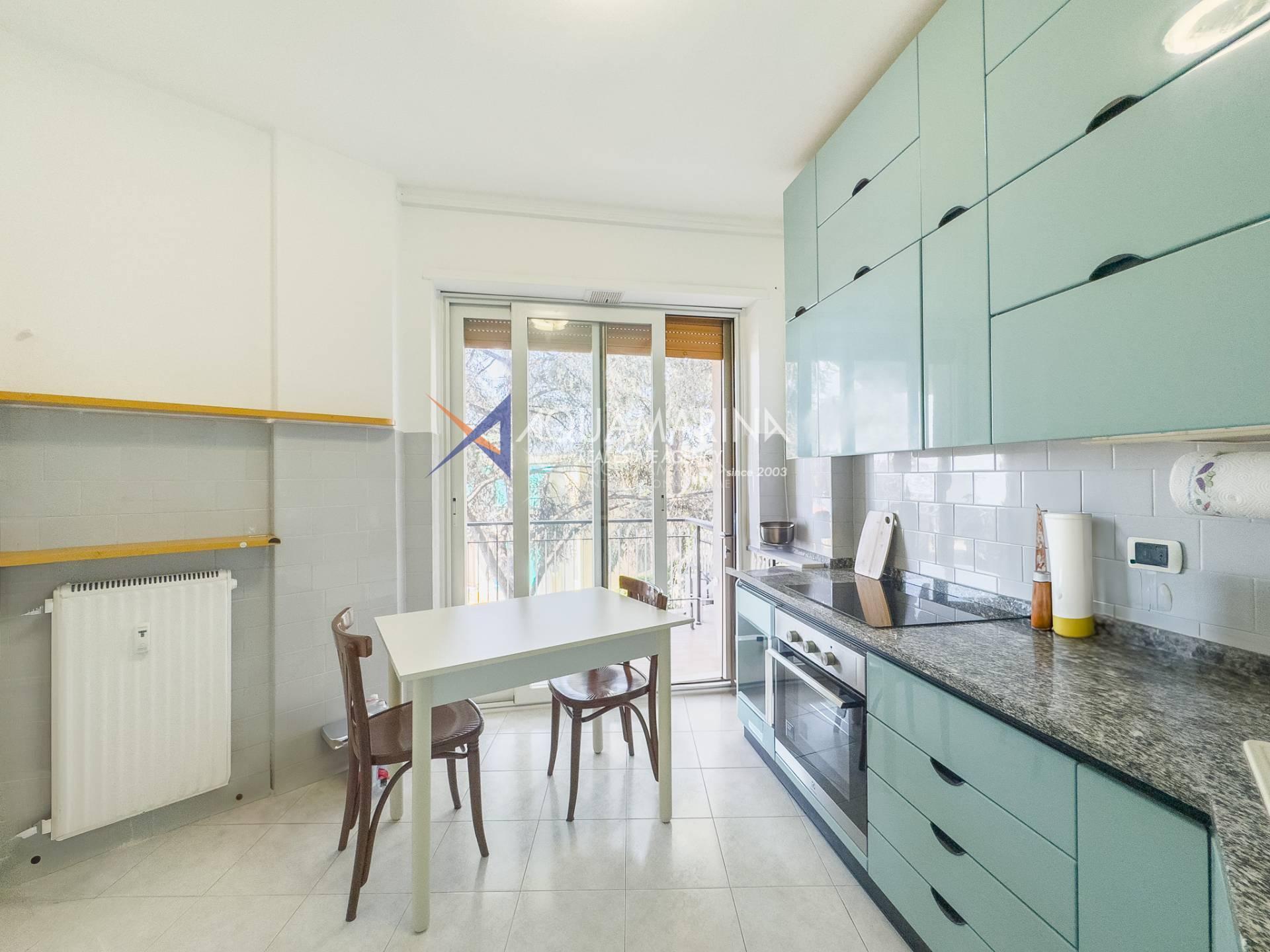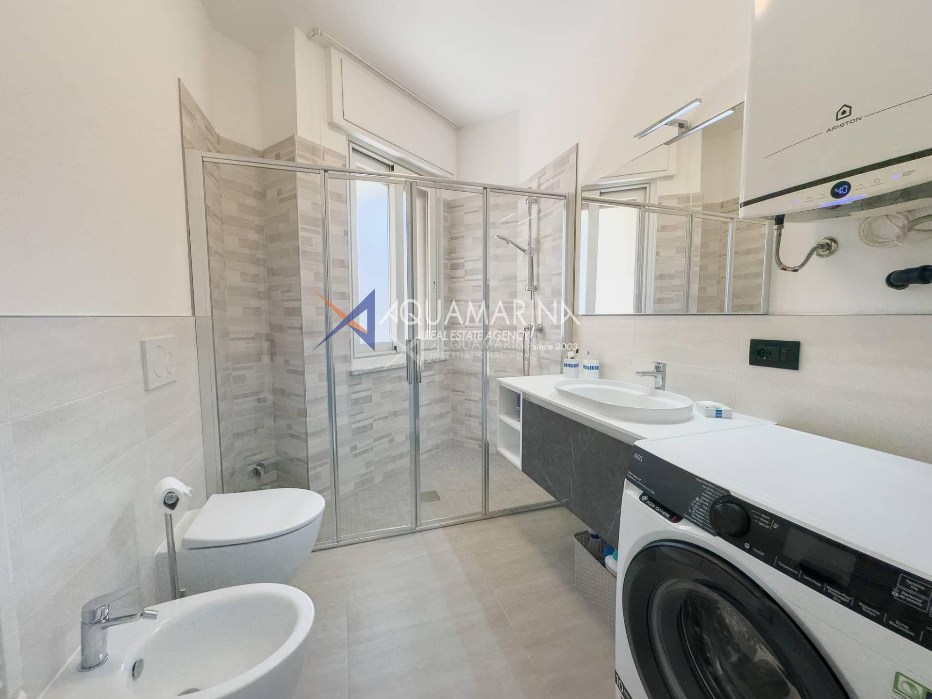 The apartment for sale in Ospedaletti is in excellent condition and comprises an entrance hall, a large living room with dining area, an eat-in kitchen, two double bedrooms, and two recently renovated bathrooms.