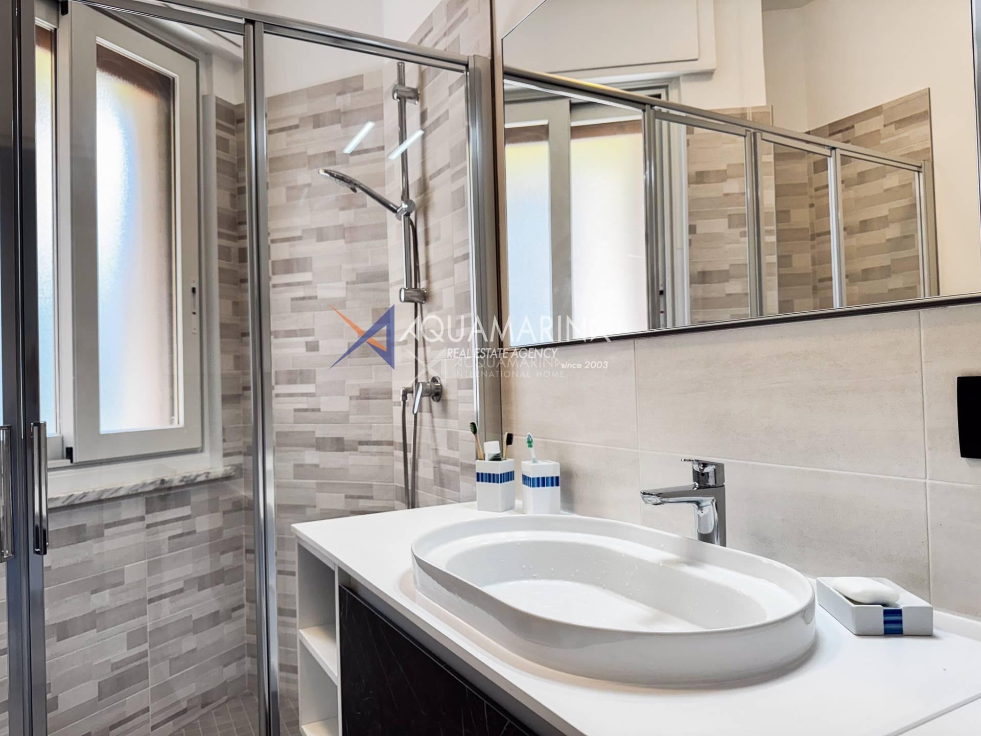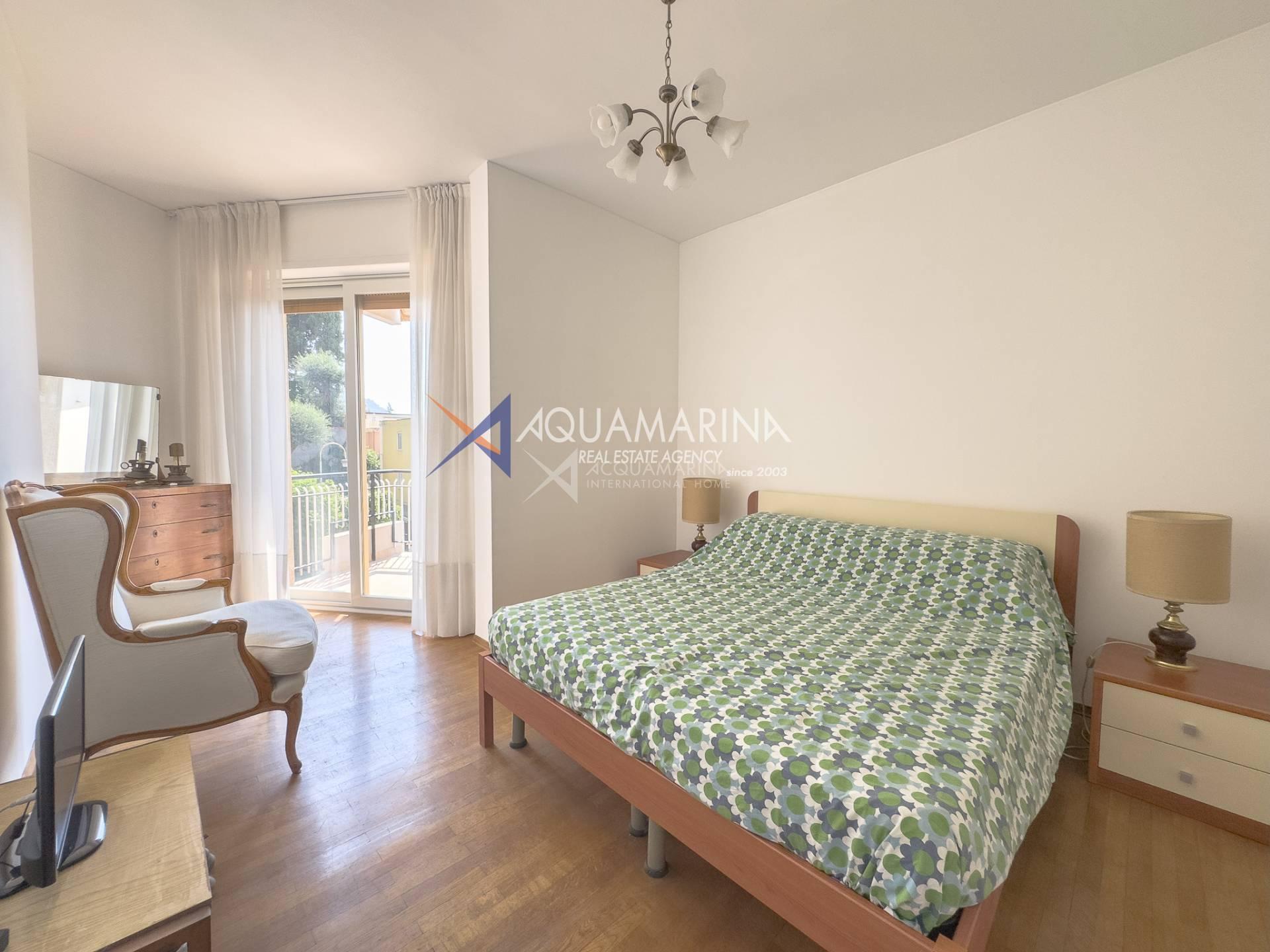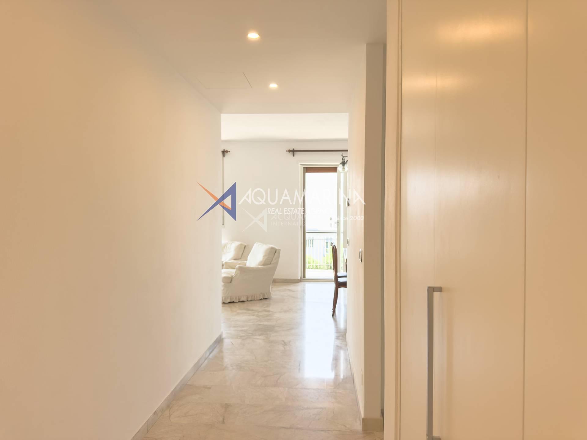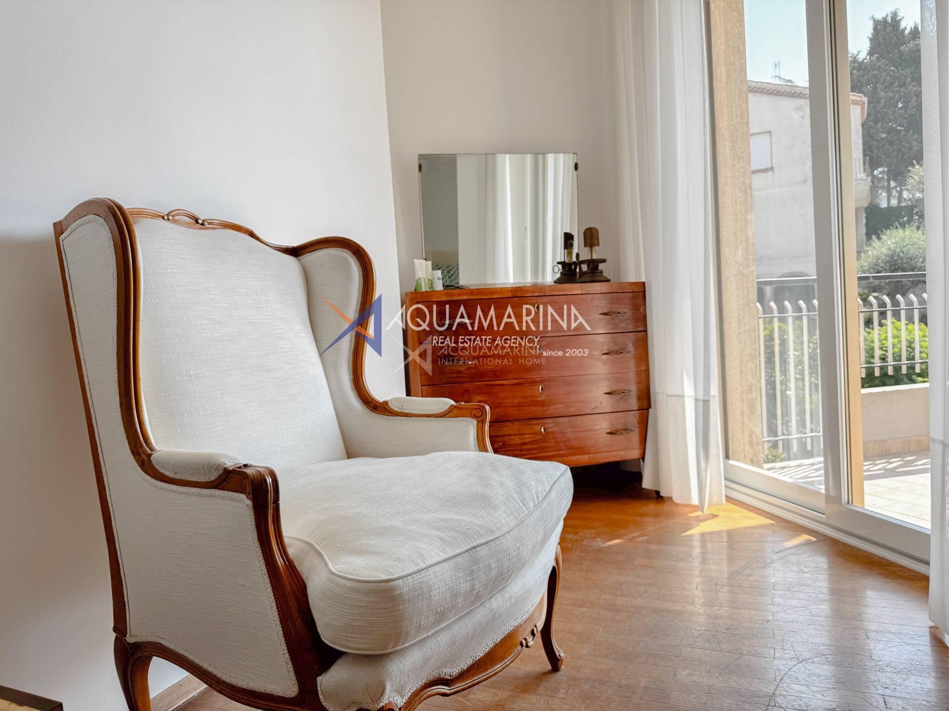 Each room has access to the terrace surrounding the apartment, which offers a pleasant view of the sea and the greenery of the well-kept communal garden.