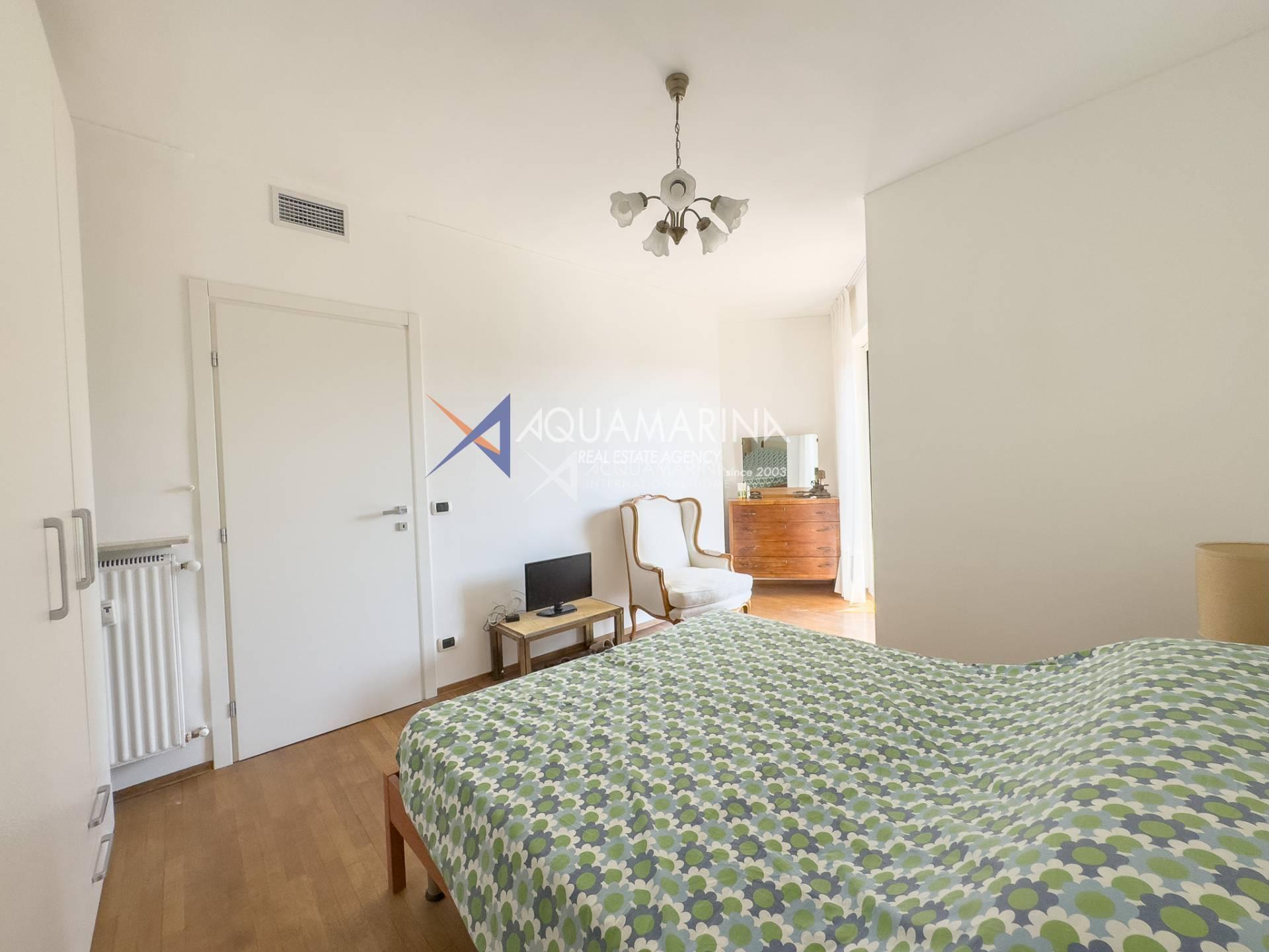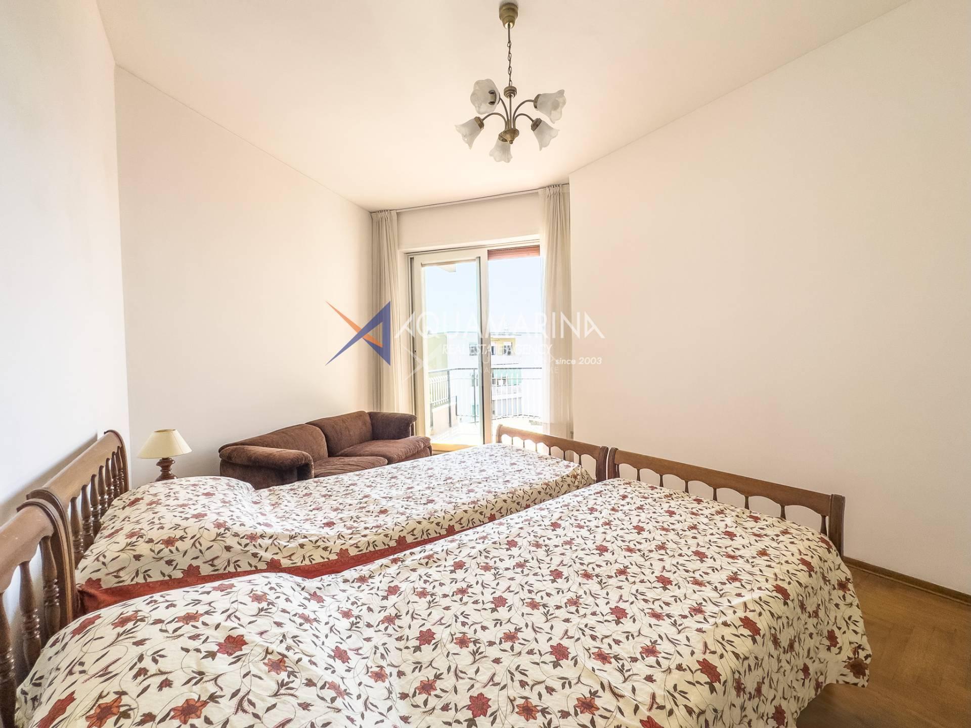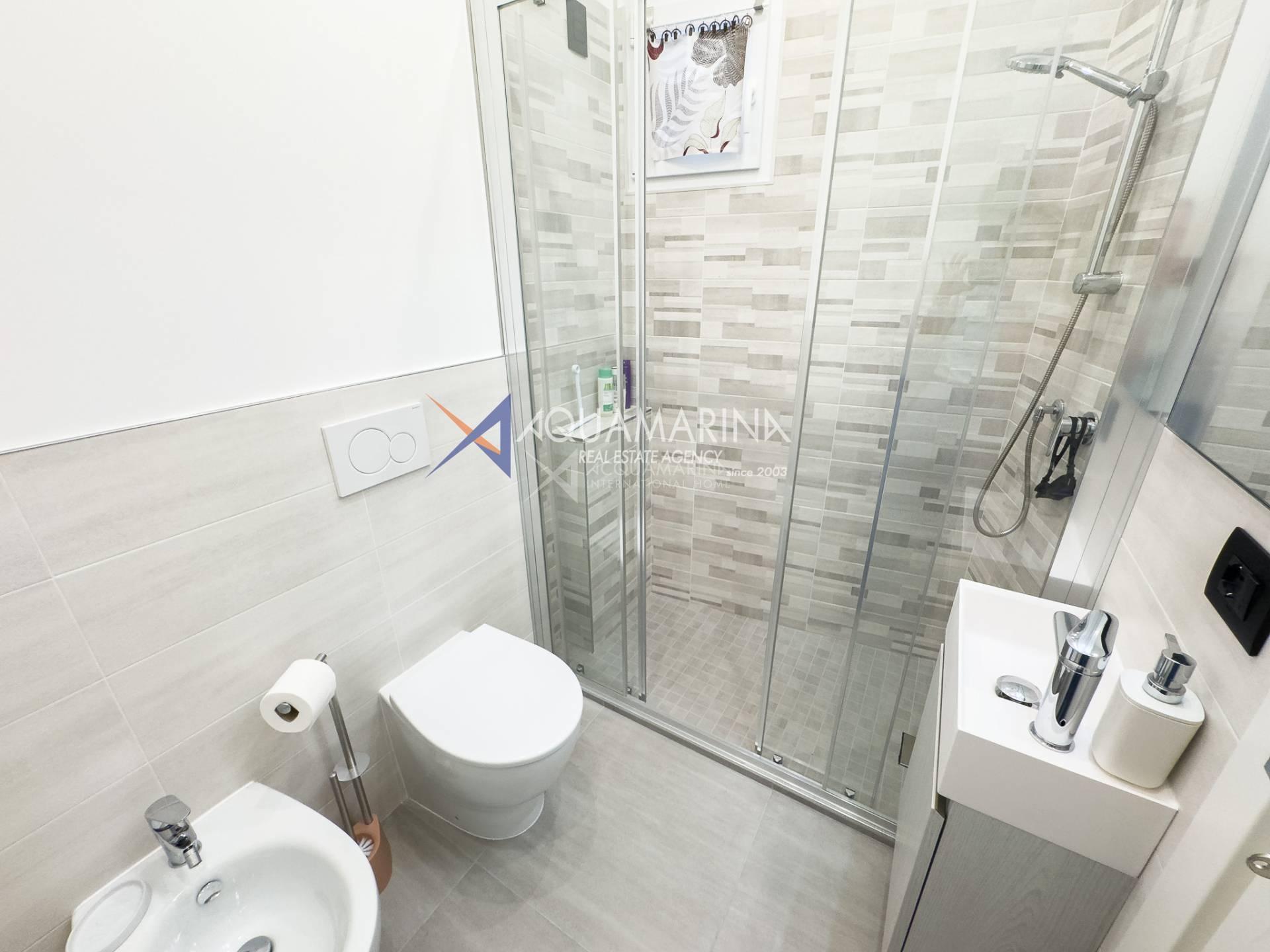 Each room has access to the terrace surrounding the apartment, which offers a pleasant view of the sea and the greenery of the well-kept communal garden.