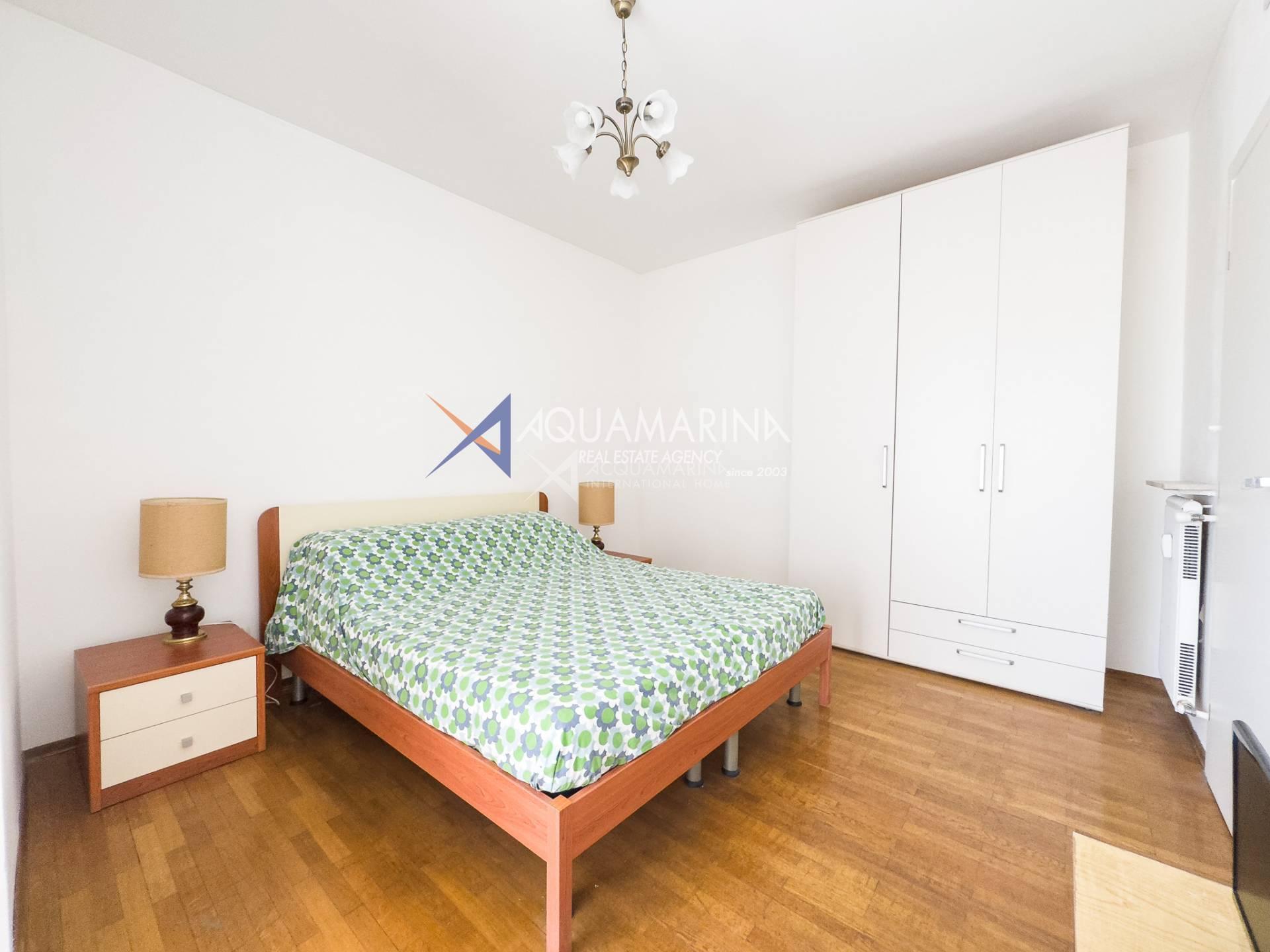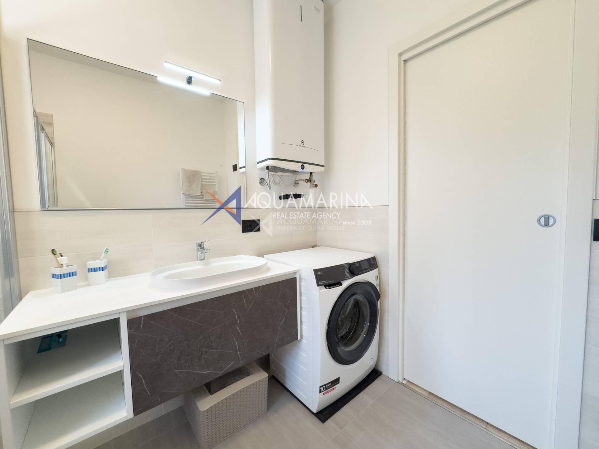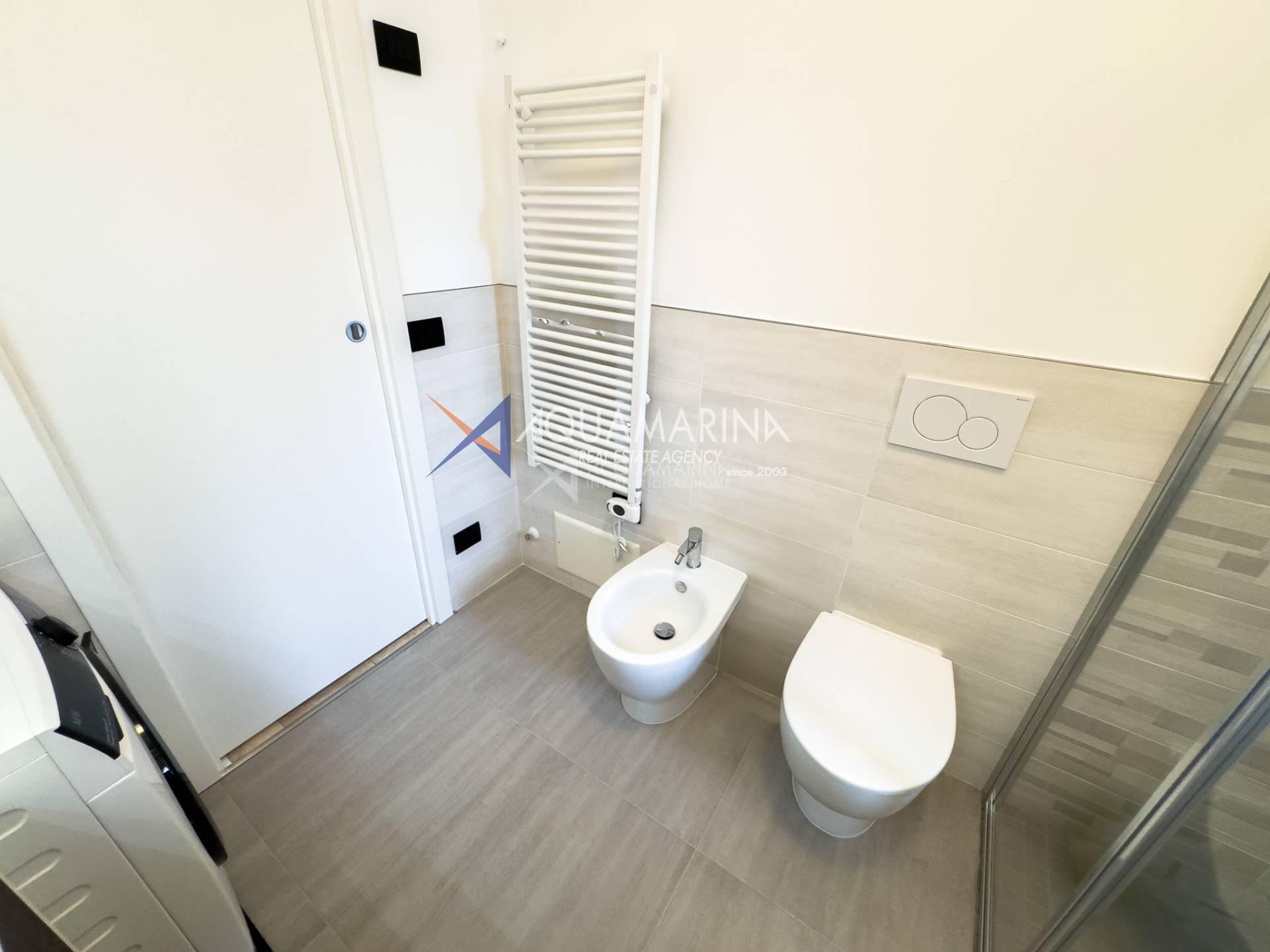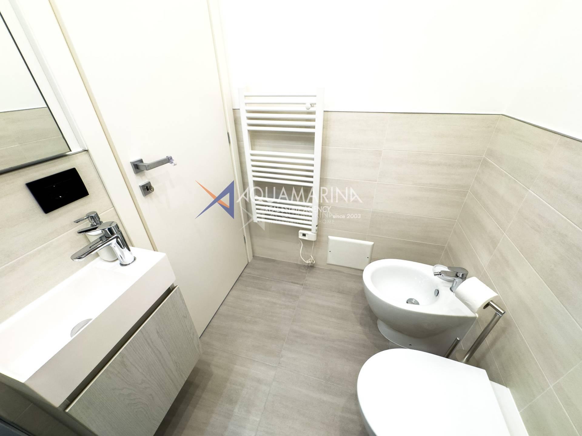 Each room has access to the terrace surrounding the apartment, which offers a pleasant view of the sea and the greenery of the well-kept communal garden.