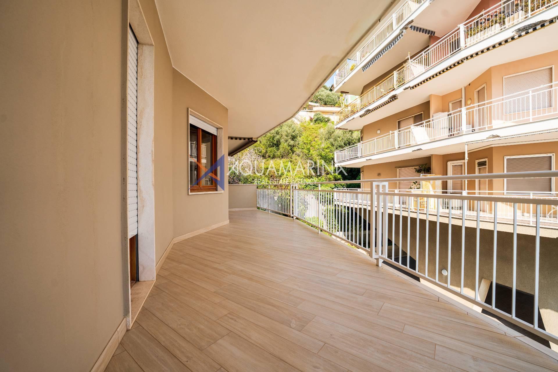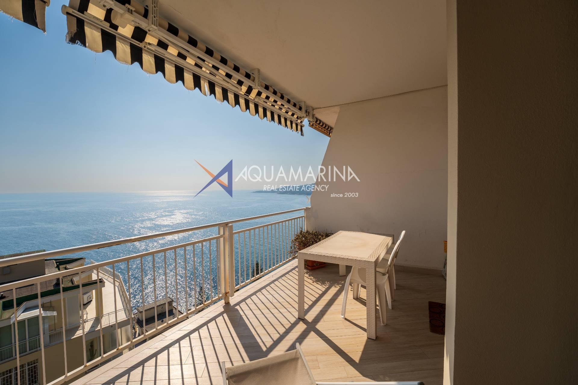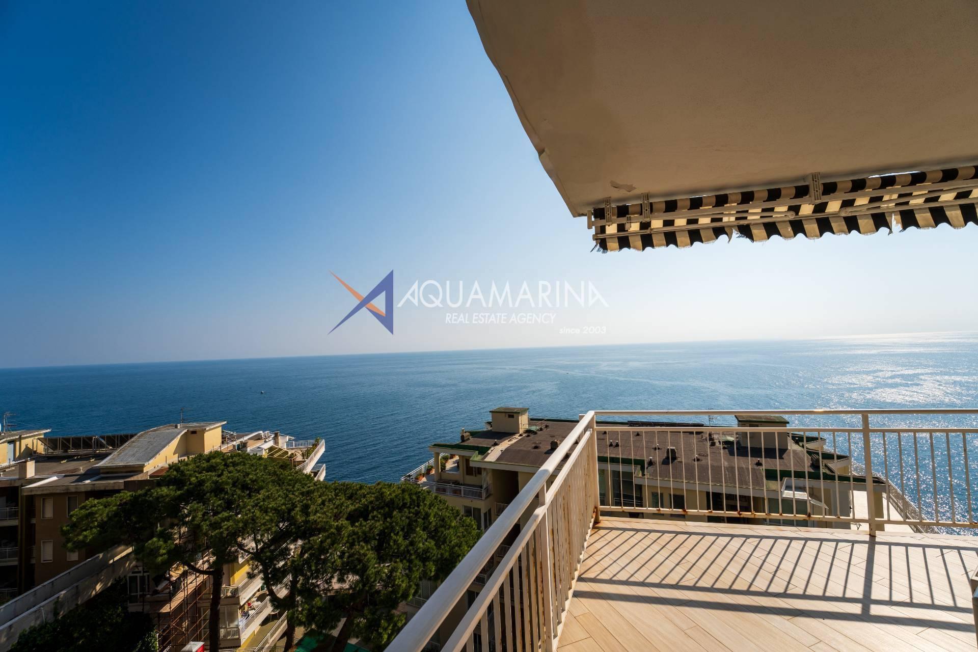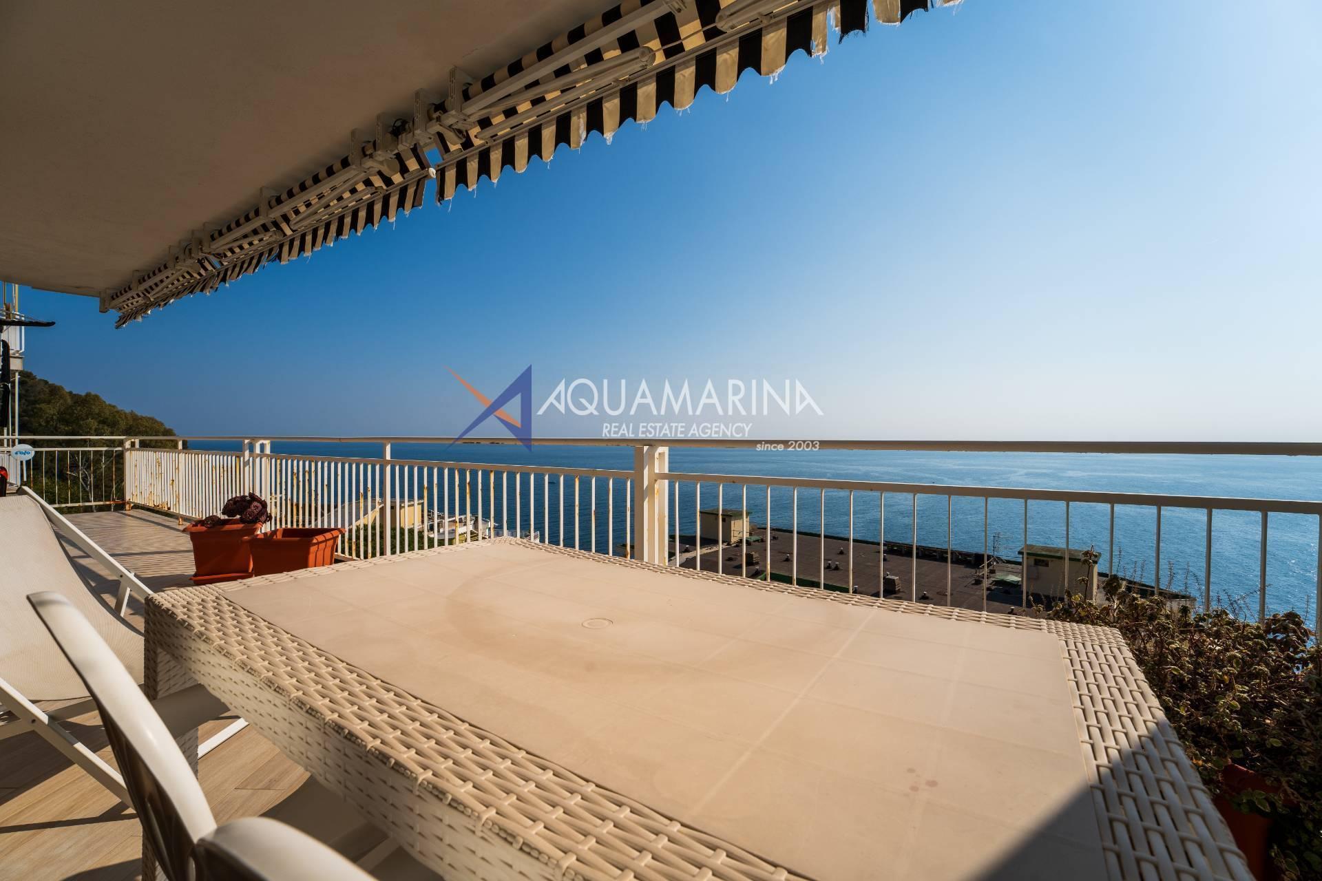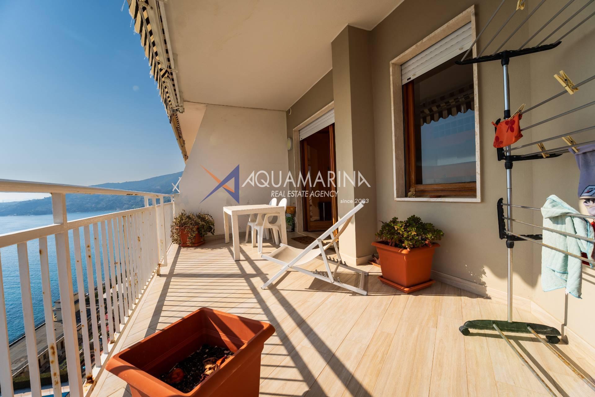 In Ospedaletti, we are selling an exclusive apartment with a breathtaking sea view. In a residential complex with a swimming pool and concierge, the Condominio Patrizia is a seafront complex in one of the most beautiful and characteristic areas of Western Liguria. We offer for sale a renovated apartment with a 50 sq m terrace offering exceptional sea views that stretch from Sanremo to France. Located on the third floor of a five-story building with an elevator, the apartment has been completely renovated and is being sold furnished. It comprises: an entrance hall, a large open-plan living room with an open-plan kitchen, two bathrooms, two bedrooms, a large walk-in closet, a storage room, and a 50 sq m terrace that wraps around two sides. The property includes a garage of approximately 20 sq m and a shared condominium parking space.