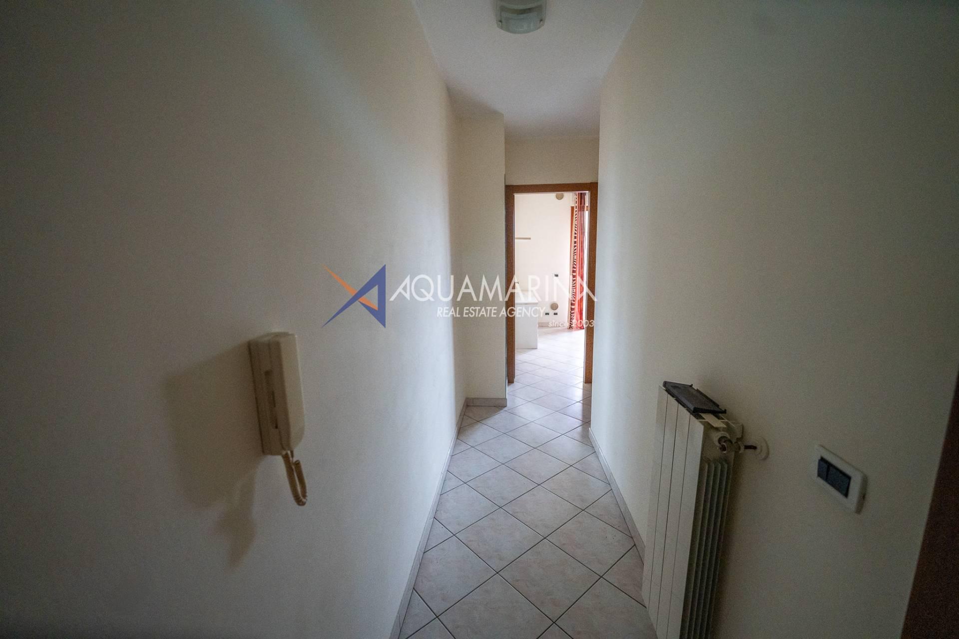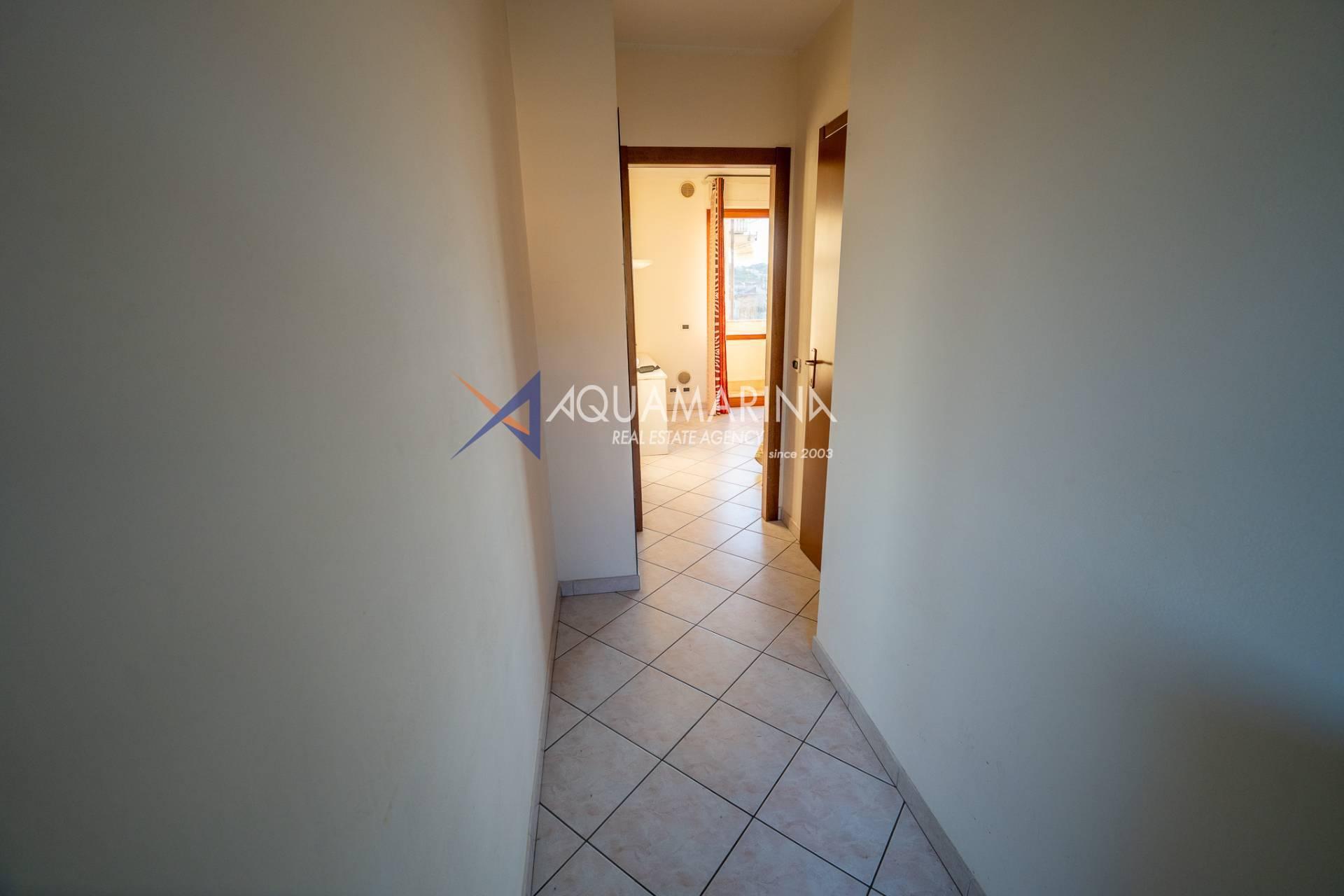 The apartment opens onto a large hallway that leads to the bright and welcoming living area with an open-plan kitchen and direct access to the terrace.
