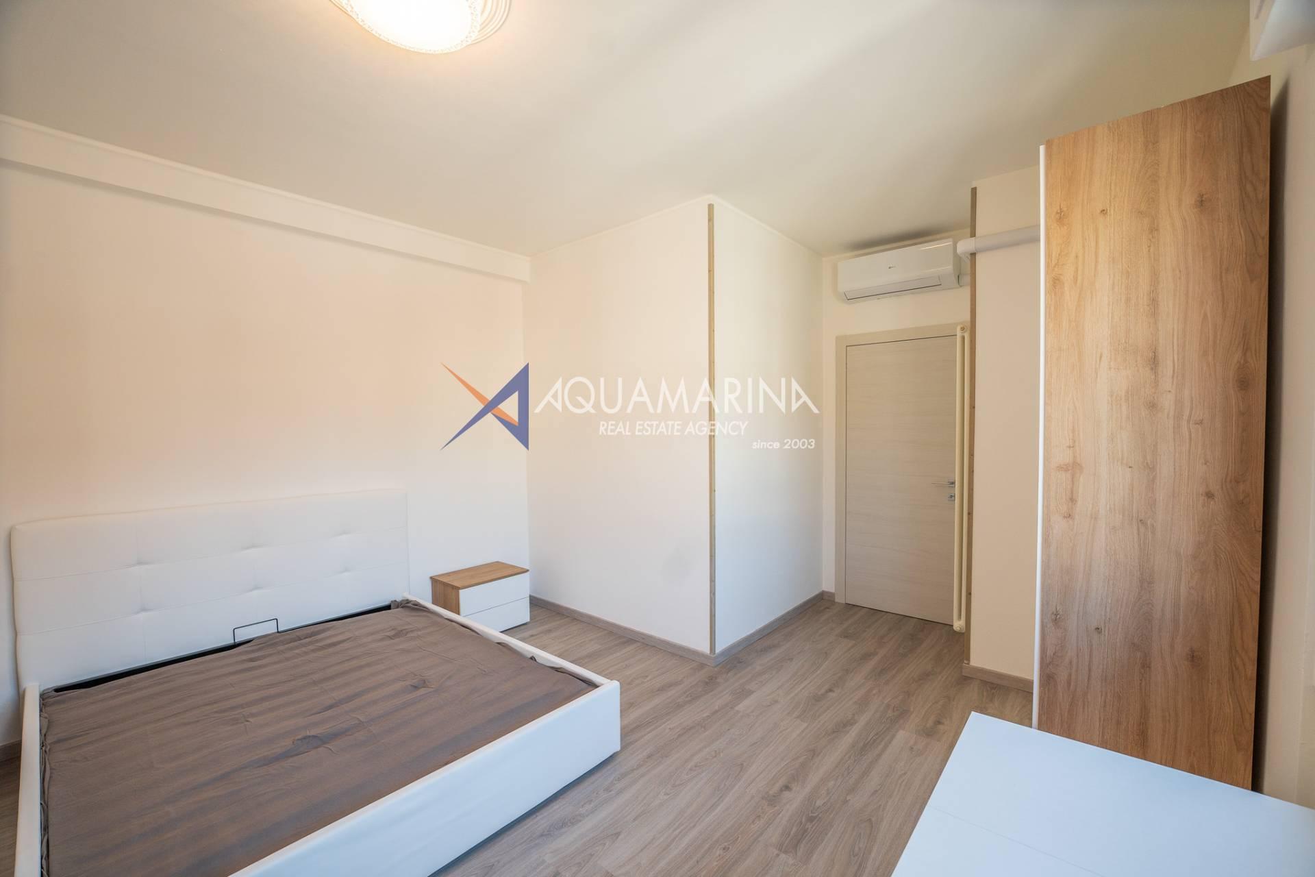 The apartment comprises an entrance hall with a security door, a large bedroom, a bathroom with a window, and a living room with an open-plan kitchenette and access to a sea-view balcony. It features independent heating, state-of-the-art air conditioning, and a state-of-the-art gas boiler.