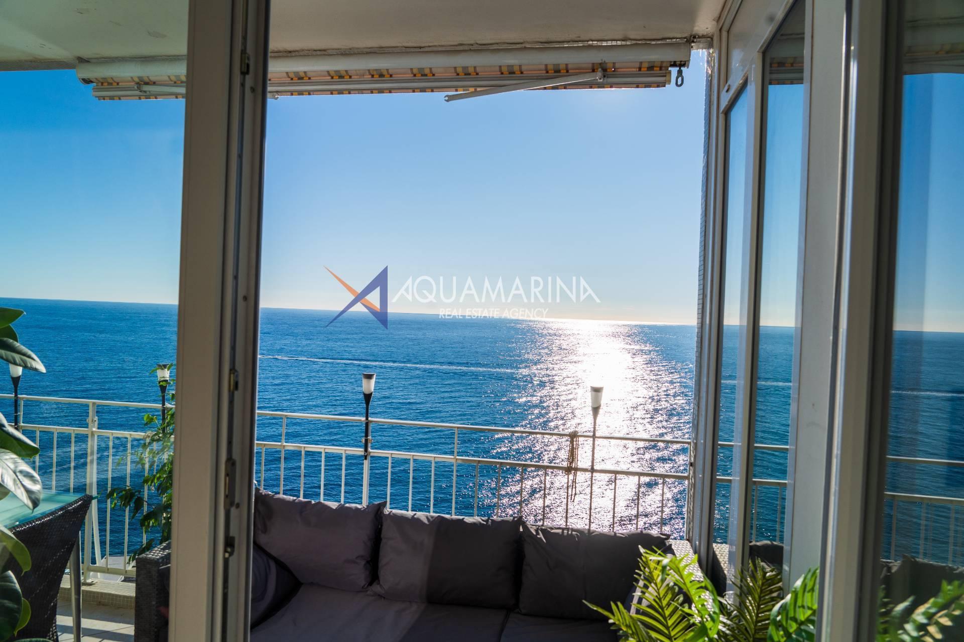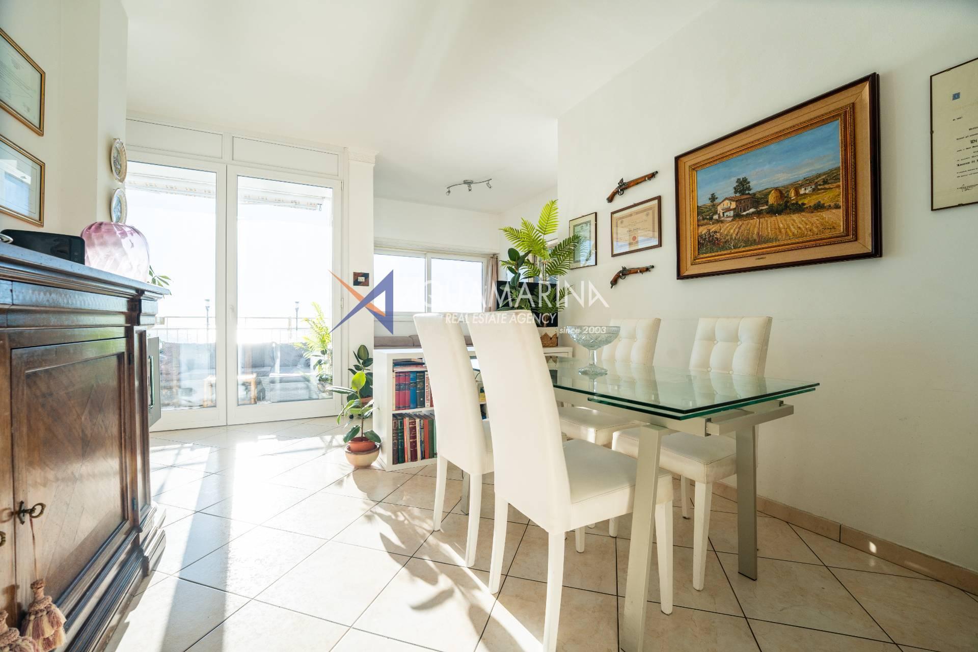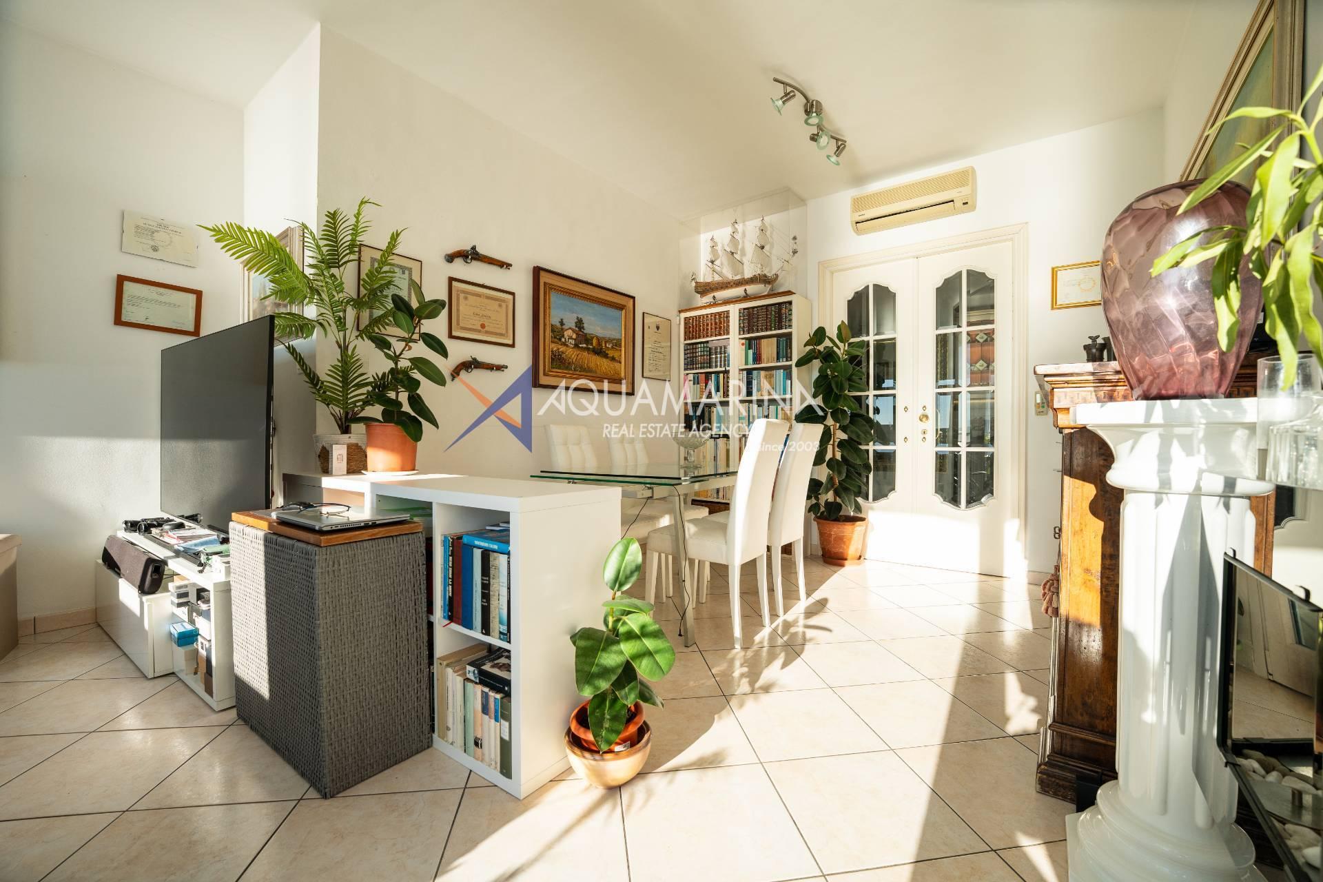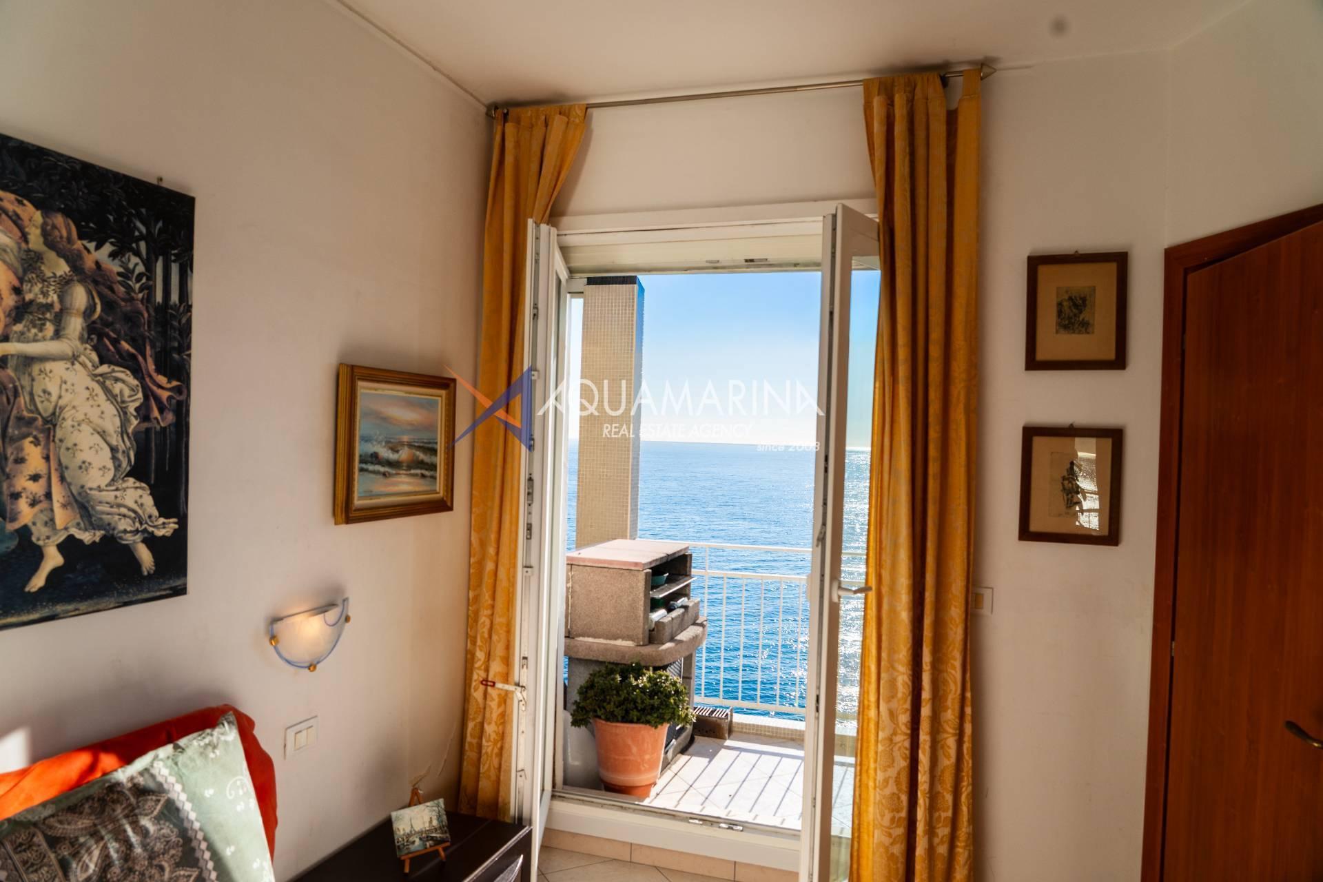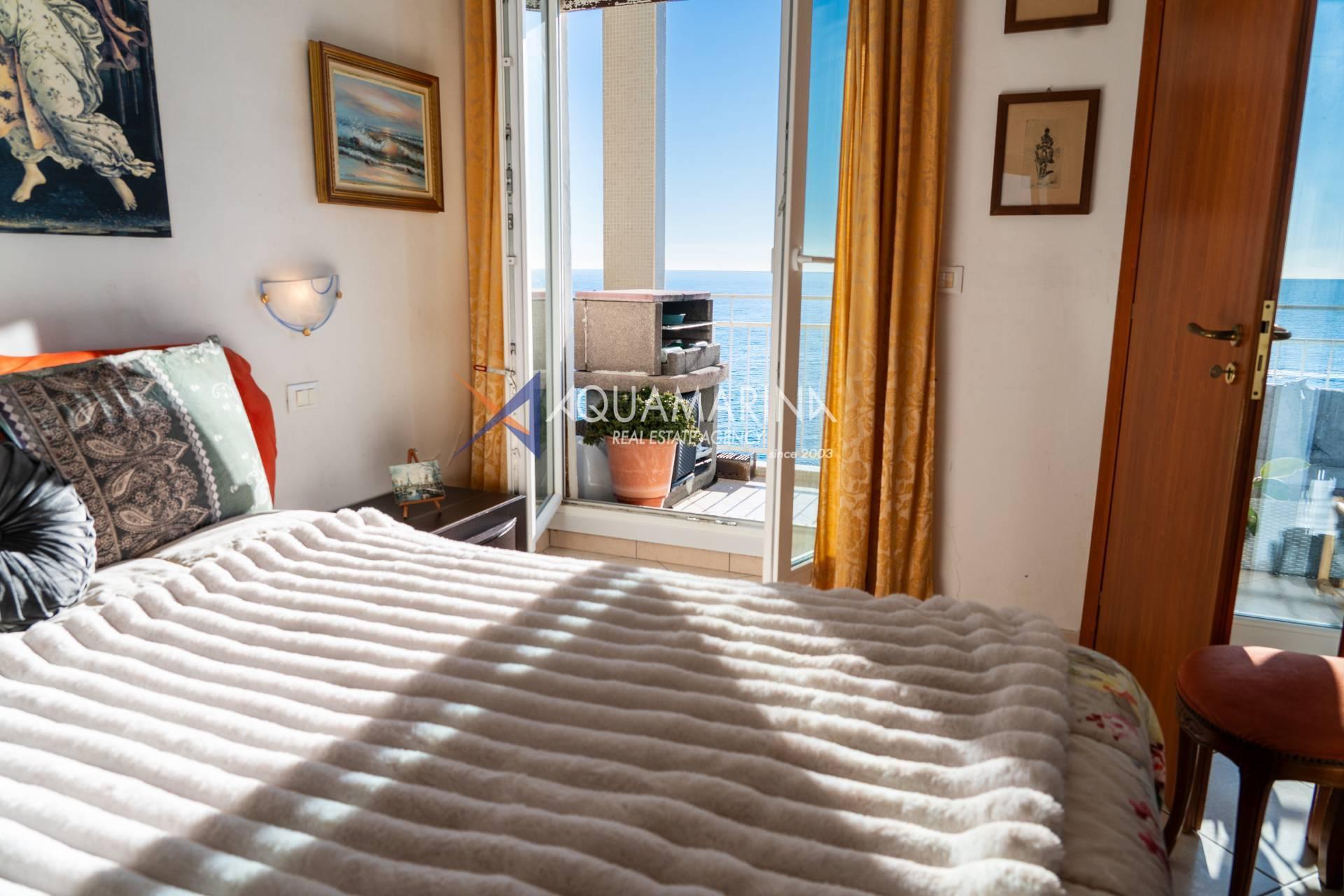 Sanremo, sea view apartment. We are selling a 5th-floor apartment with elevator, practically on the seafront with breathtaking views. It overlooks the sea with a 180° view of Capo Nero, one of the most picturesque spots on the Riviera di Ponente. Thanks to its location and large windows, the apartment is flooded with natural light, while the large terrace allows you to enjoy a priceless view while simultaneously relaxing in total tranquility, practically in the middle of the sea. The property comprises an entrance hallway, an open-plan kitchen with pantry and sea-view window, a double living room with a window overlooking the sea and access to the terrace, two bedrooms with views and access to the terrace, a bathroom with window, a second half-bathroom, a large terrace, a balcony, and a cellar. Heating is independent with a suspended fireplace and a heat pump that heats and cools the apartment. The exterior windows are made of PVC with double glazing.