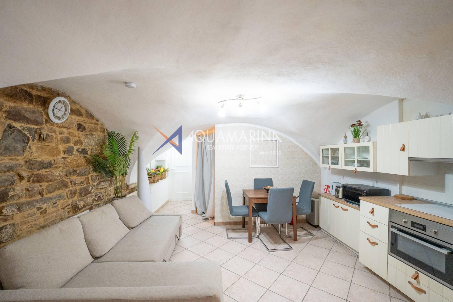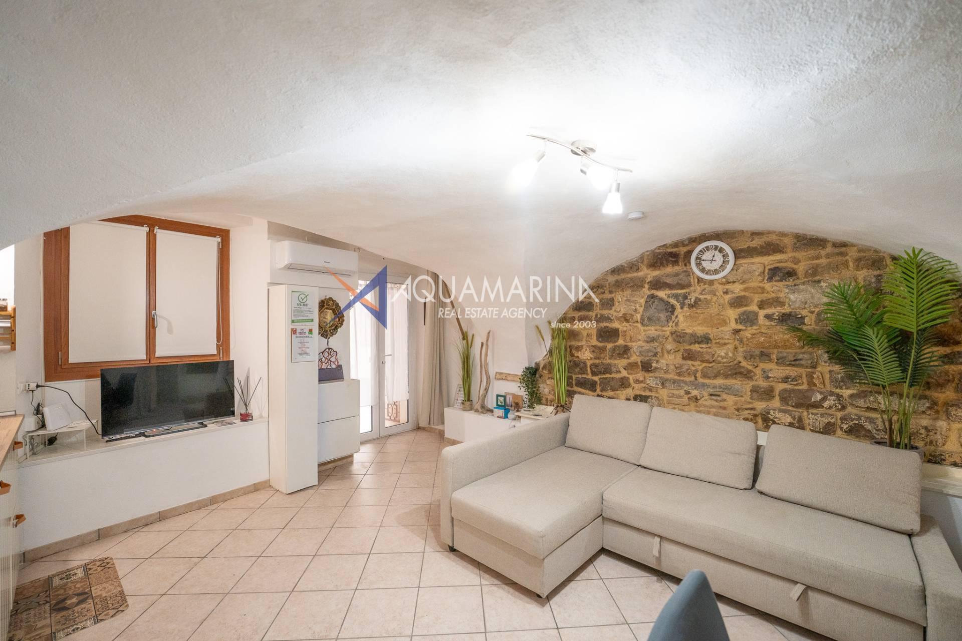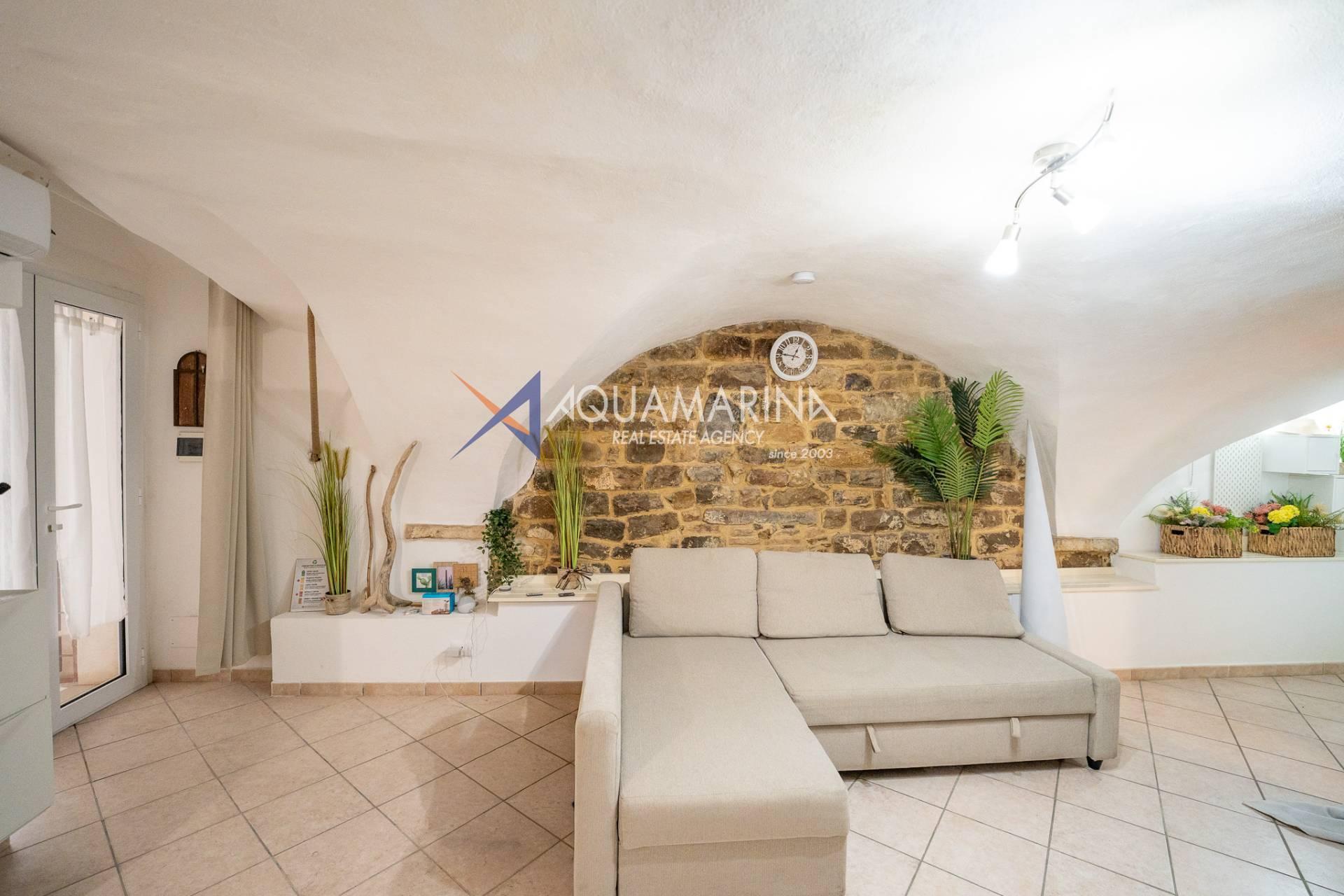 The interiors, thoughtfully designed with great attention to detail, are harmoniously arranged into a bright living area enhanced by exposed stone and a linear kitchen, along with a private and cozy sleeping area. The bathroom, modern and refined, is equipped with a shower box and functional amenities, including a washing machine.