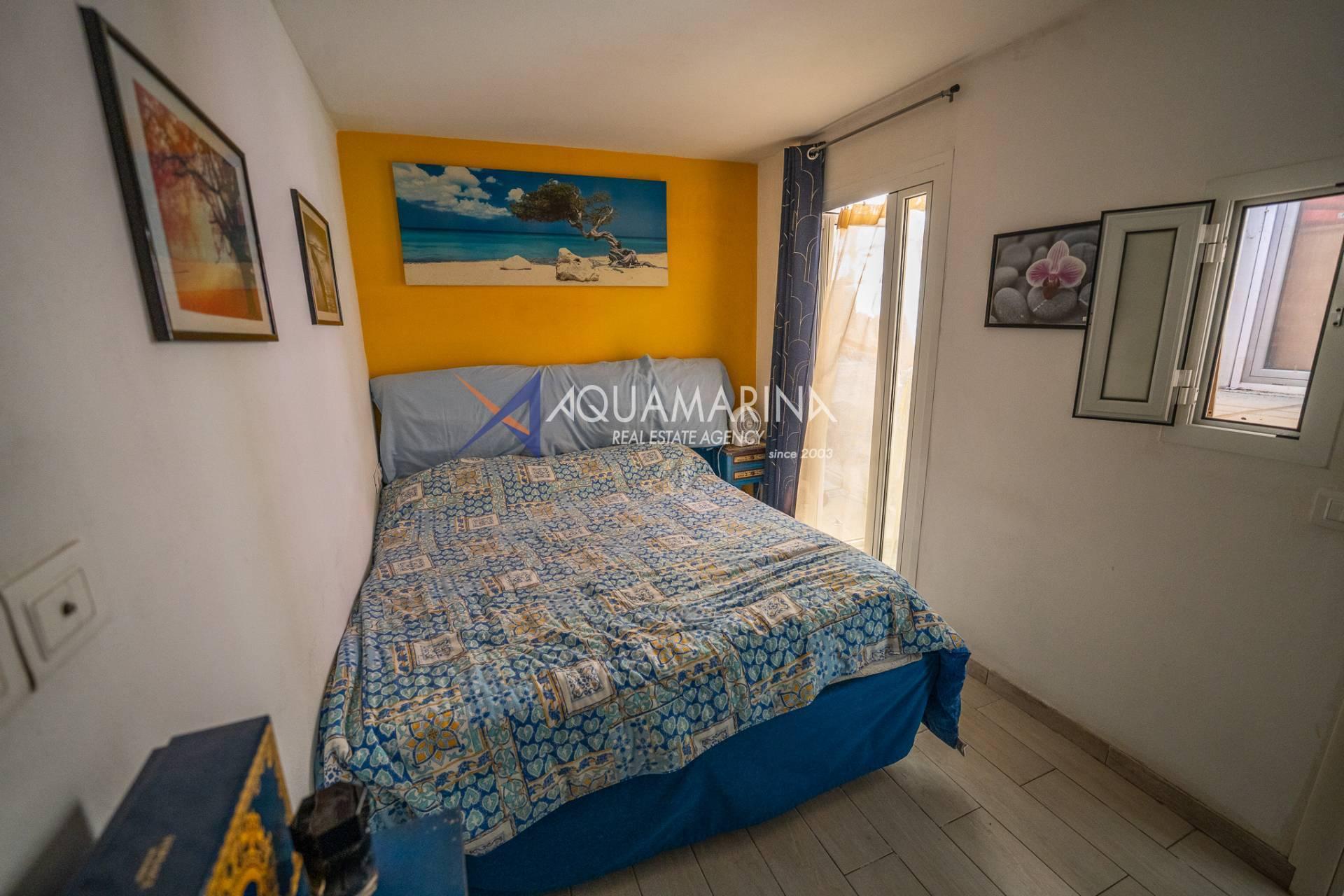 The entrance opens onto a hallway that leads to the spacious living area with an open-plan kitchen. Next, we find the double bedroom and the bathroom, with a window and both a tub and a shower.