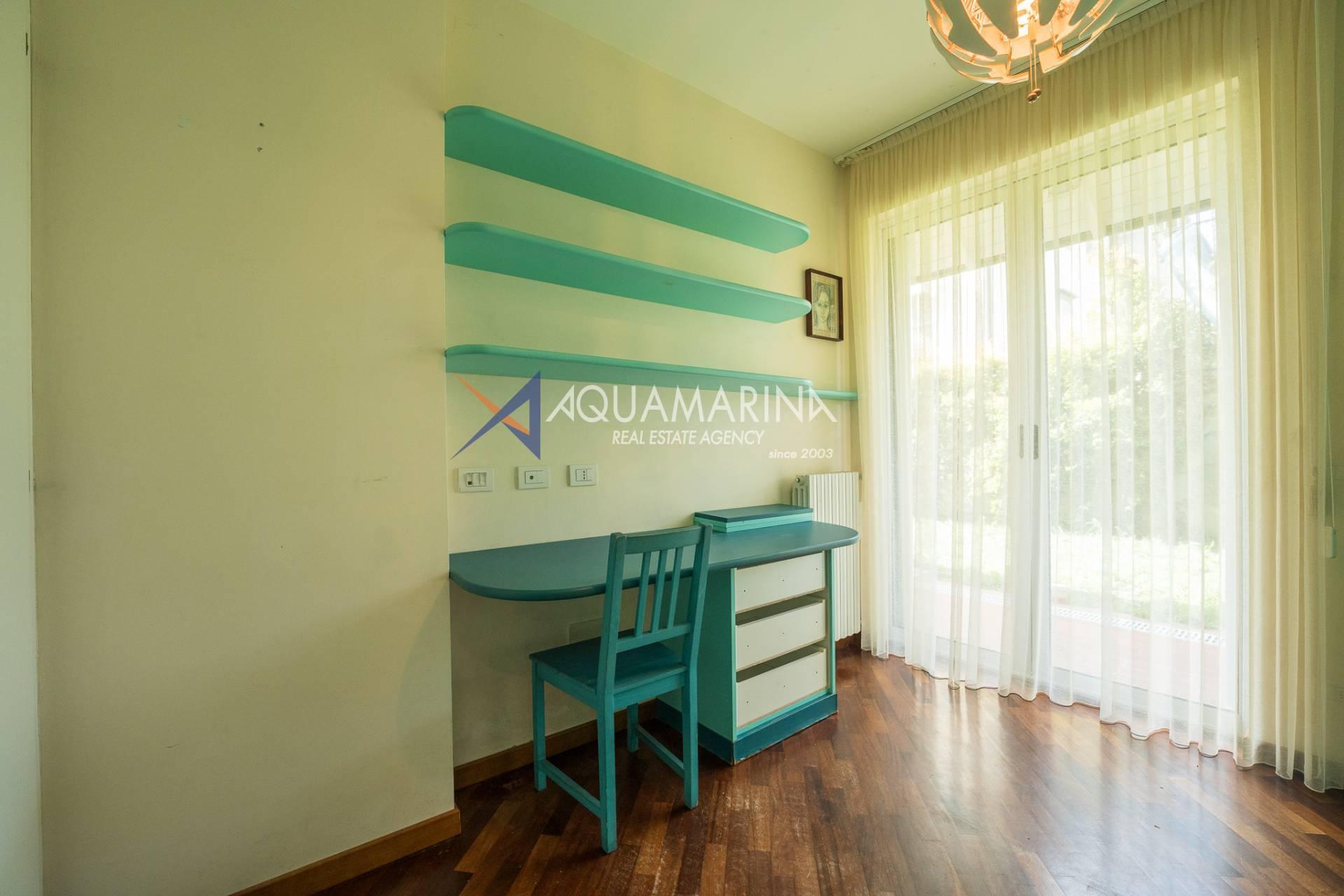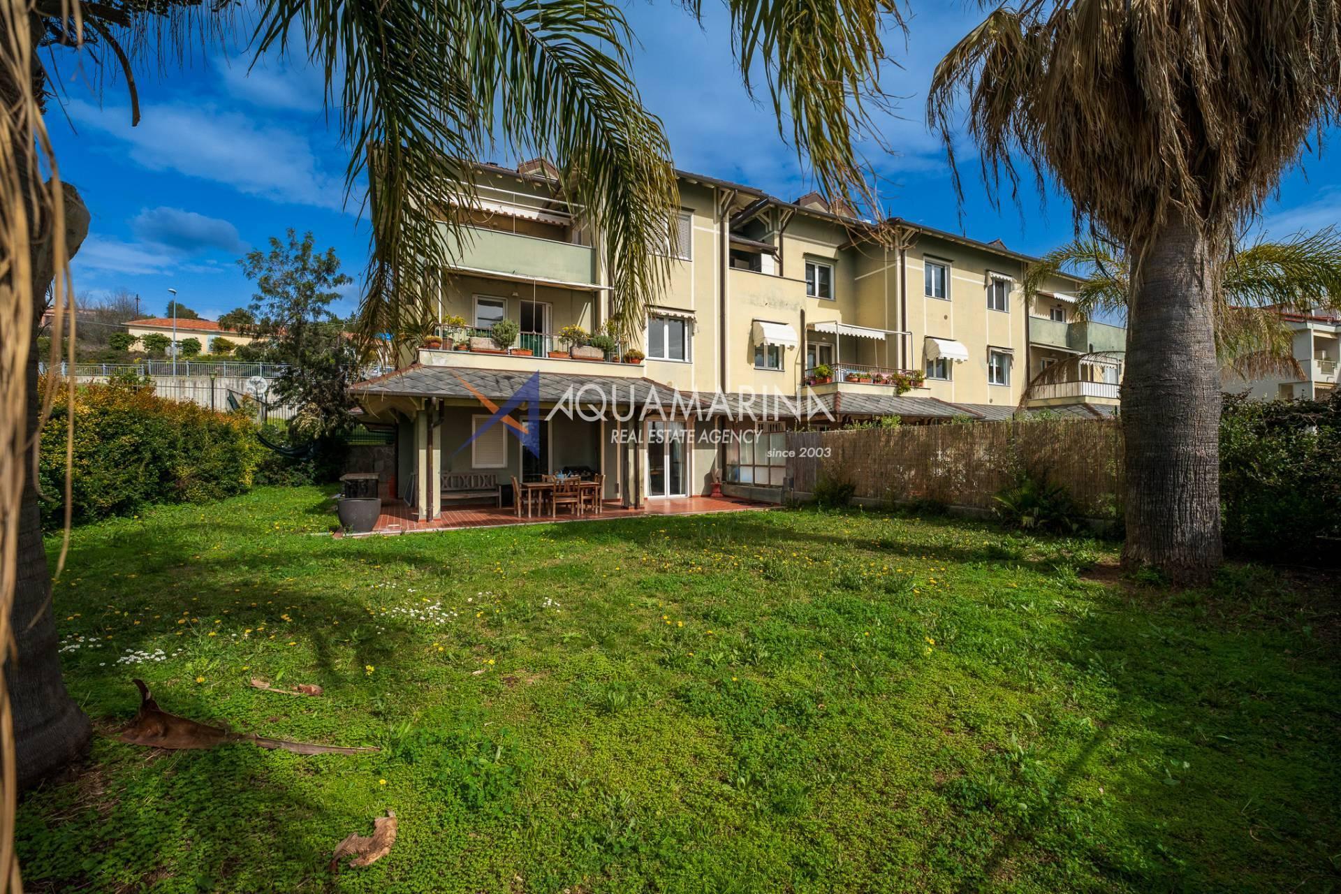 The apartment, elegantly furnished, consists of entrance hall, living room, kitchen, three bedrooms, two bathrooms, a third bathroom with hallway, and the possibility of creating additional bedrooms in the basement, a stunning private garden of 250 square meters with a porch, and direct access to a large garage.