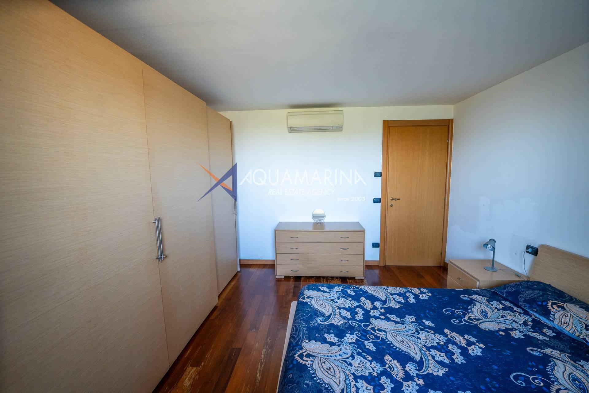 The house comprises a private entrance onto a large living area with an open-plan kitchen and a sofa area with a floor-to-ceiling window leading to a habitable terrace with a panoramic view of the sea and hills.
