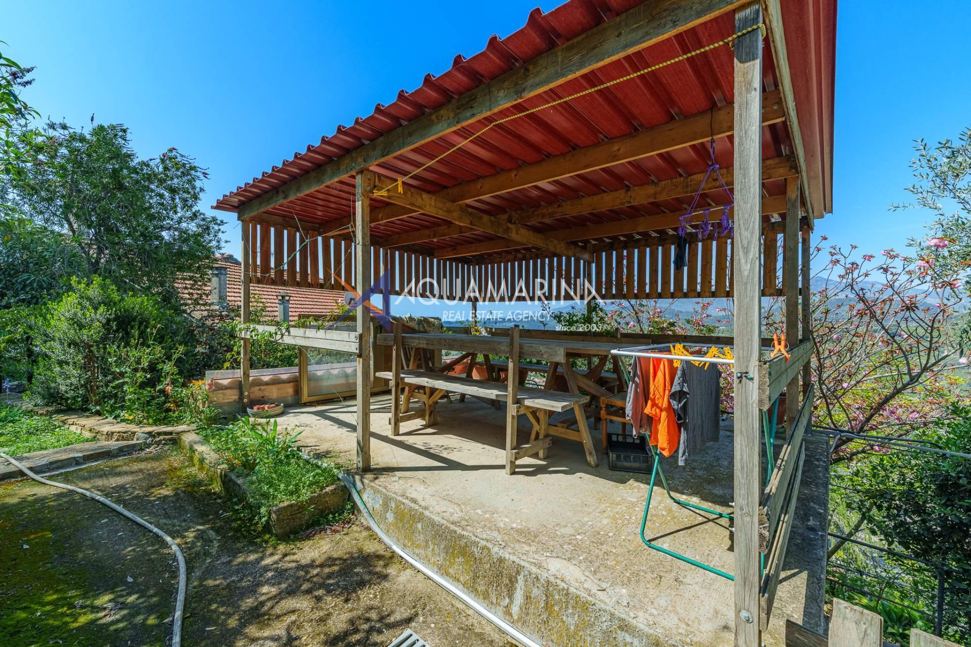 The surrounding land is approximately 1300 m2 and includes a garden with olive and fruit trees, a recreational area.